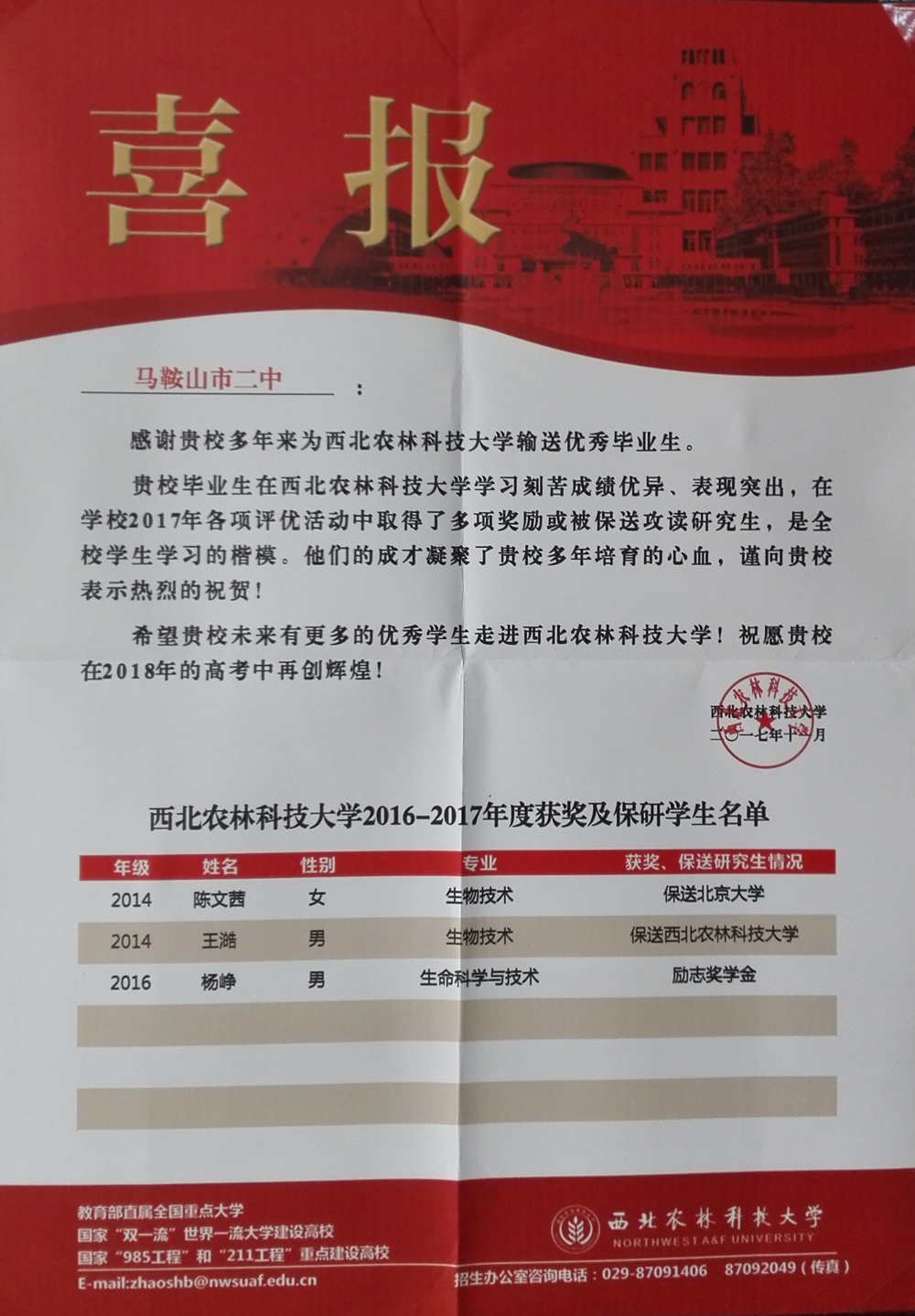 您現(xiàn)在的位置(zhì):首頁 - 新聞中心 - 校園新聞 - 西北農林科技大學喜報
