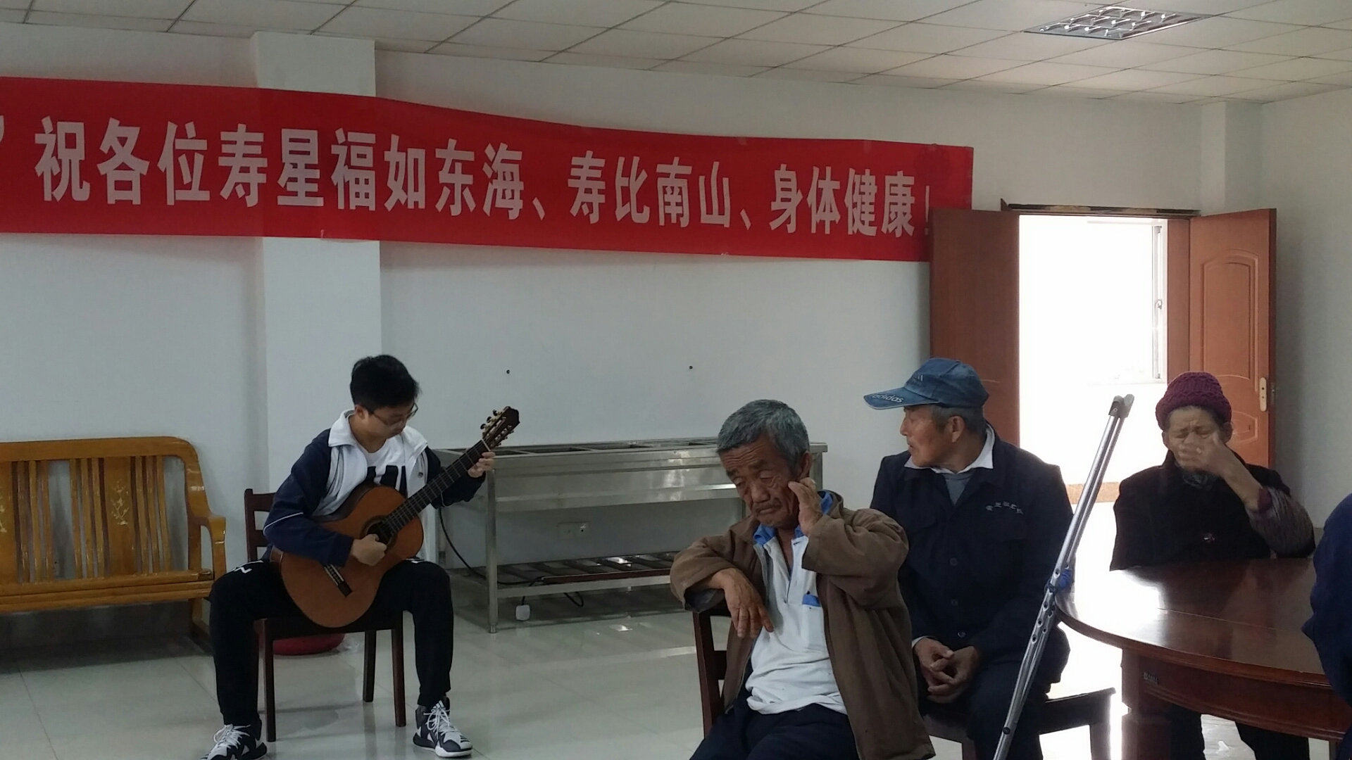 走進福利院,映入眼簾的便是幹淨(jìng)整潔的房間。在工作人員的安排和同學們的幫扶,老人(rén)們陸續(xù)來到集會廳。同學們為老人家表演了精心準(zhǔn)備的文藝節目(mù),和他們歡聚一堂。一曲唱畢,老人用熱烈的掌聲(shēng)表達對91视频网站的感謝。在這充滿溫暖的地方,在這個溫馨的時刻,同學們紛(fēn)紛向老人獻(xiàn)上(shàng)自己的禮物,貼心地為其講解用法。青春與夕陽在愛的感召下(xià),其樂(lè)融融。