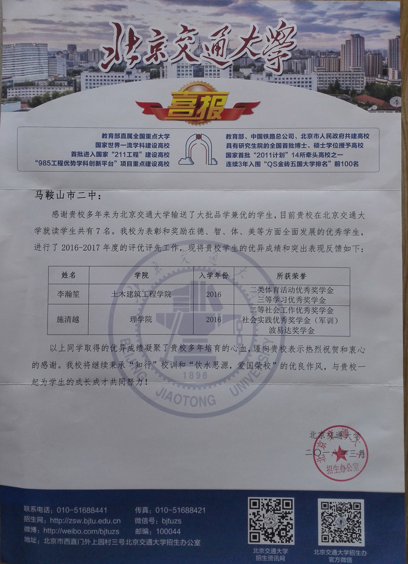 北京交(jiāo)通大學喜報