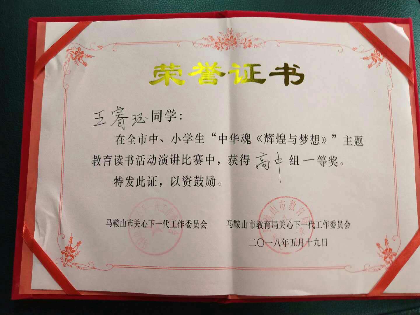5月19日上午,我校高一(16)班王睿玨同學在全市中、小學生“輝煌與夢想”主題教育讀書活動演講比賽中,獲得高中組(zǔ)一(yī)等獎的優異成績。