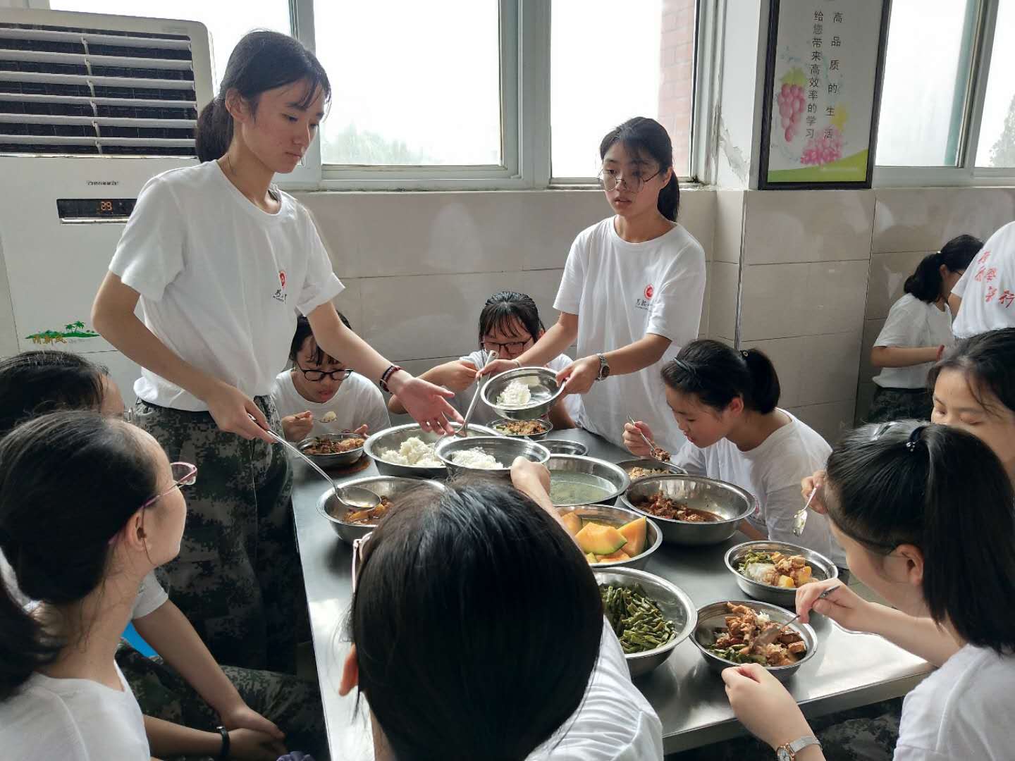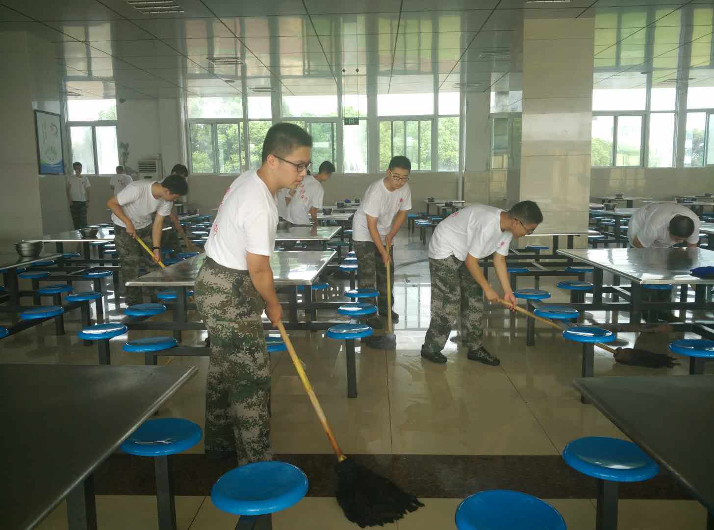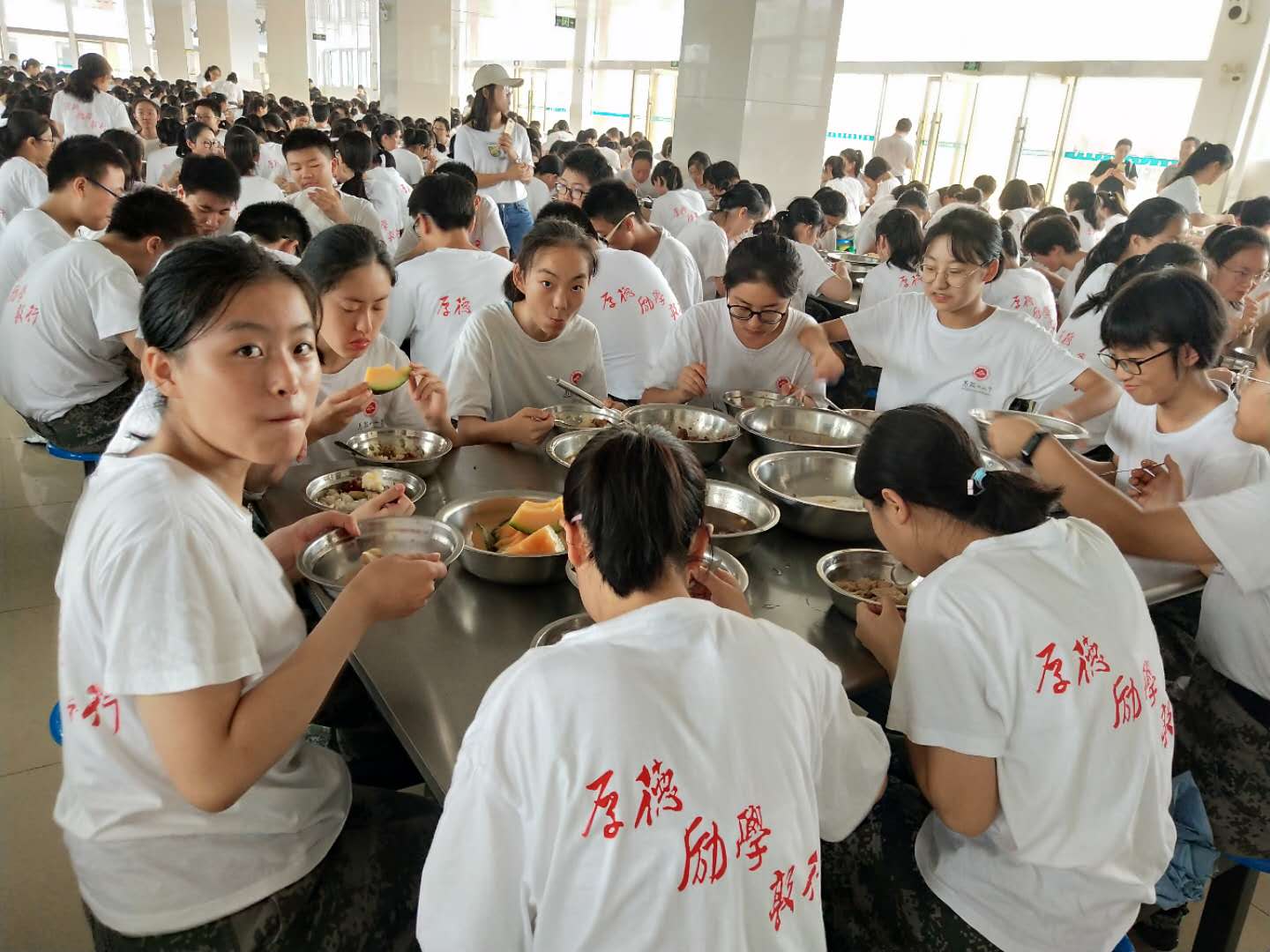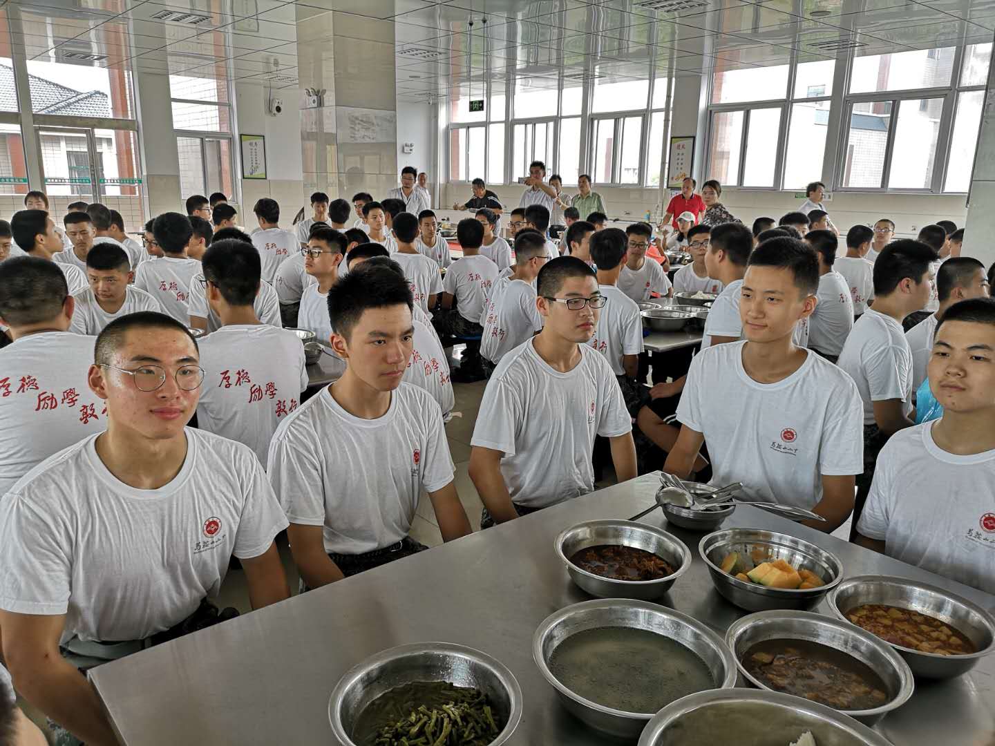 十一時三十分(fèn),天空下起了(le)小雨,給綠樹環(huán)蔭(yīn)的軍訓基地送來了(le)些許(xǔ)涼意。學生們在教官的帶領下來到食堂,十人一桌,近(jìn)千人的食堂安靜有(yǒu)序,等候(hòu)開飯命令。開飯指令下達,大家分工合作,大快朵頤,飯菜或許沒有家庭的(de)精致,但是(shì)學生還是吃的津津有味。午餐(cān)後,學生整齊有序回到宿舍,準備午休,養精蓄(xù)銳,迎接下午的戰鬥。
