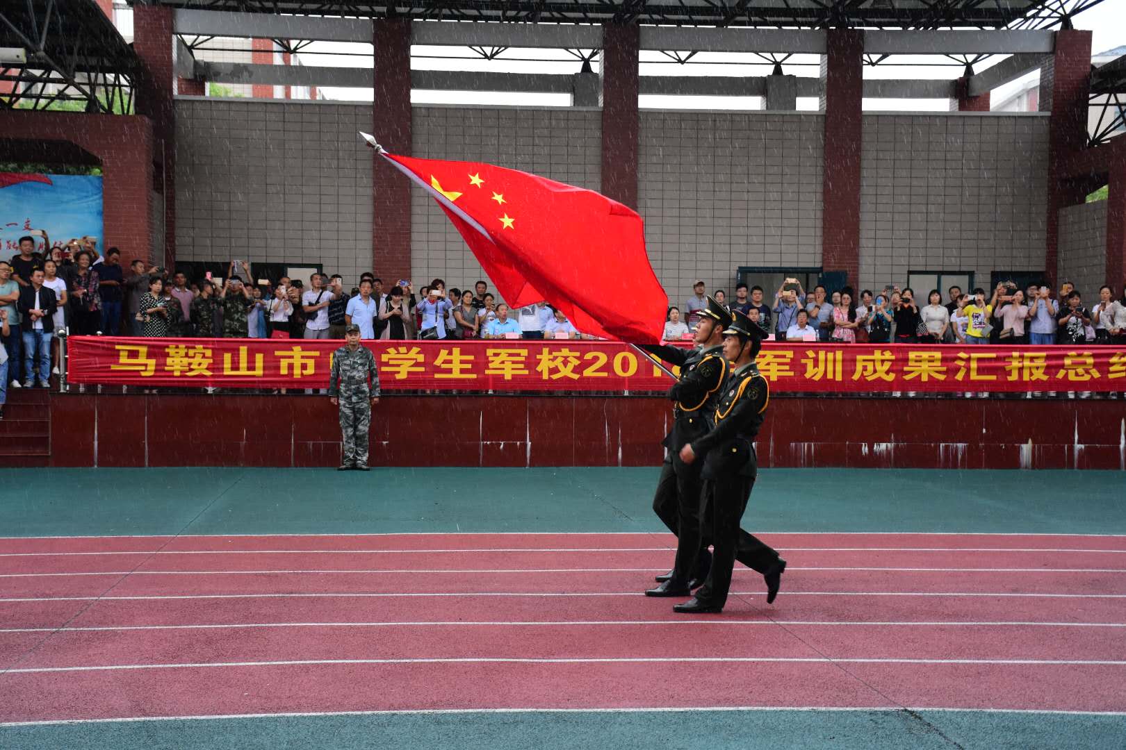 大會首先(xiān)由全體成員(yuán)一起高唱國歌,莊嚴肅穆的氣氛感染了全場師生(shēng)。接著由114班章可欣同學代表我校2018級全體(tǐ)同學就(jiù)本次軍訓的難(nán)忘經曆作了精(jīng)彩的發言。隨後,陸秋雯副書記向接受檢閱的所有同學發表了熱情(qíng)洋溢的(de)講話,對同學們優秀的表現(xiàn)給予充分肯定,對教官(guān)、老師和家長們的關心愛護表示衷心的感謝,對二中學子寄予了厚望。然後同學們在教(jiāo)官的帶領下齊唱《團結就是力量》,歌聲豪邁嘹亮、響徹雲霄,贏得了(le)在場領(lǐng)導(dǎo)和家長的陣陣掌聲。最後,由教官組成的(de)儀仗隊迎著風雨完成了送國旗(qí)的儀式,本次高一新(xīn)生軍訓活動也就此(cǐ)落下了帷幕。