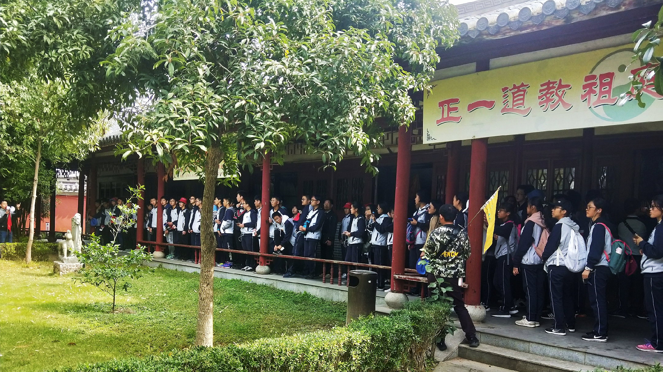 從《道德經》中同學們初步(bù)了解了道家思想,為了讓學生更切實體會到道家文化(huà),接下來的研(yán)學之旅,同學們來到了上清(qīng)古鎮。這裏(lǐ)有源遠流長道教文化,富有特色的名勝古跡,古仆(pú)淳厚的民俗風情。在導遊(yóu)的領導下,學生們見識到了600年前張天師時期的一丈多(duō)高青銅鍾、南宋時期的古井、高大的千年雌雄羅漢鬆(sōng)等。