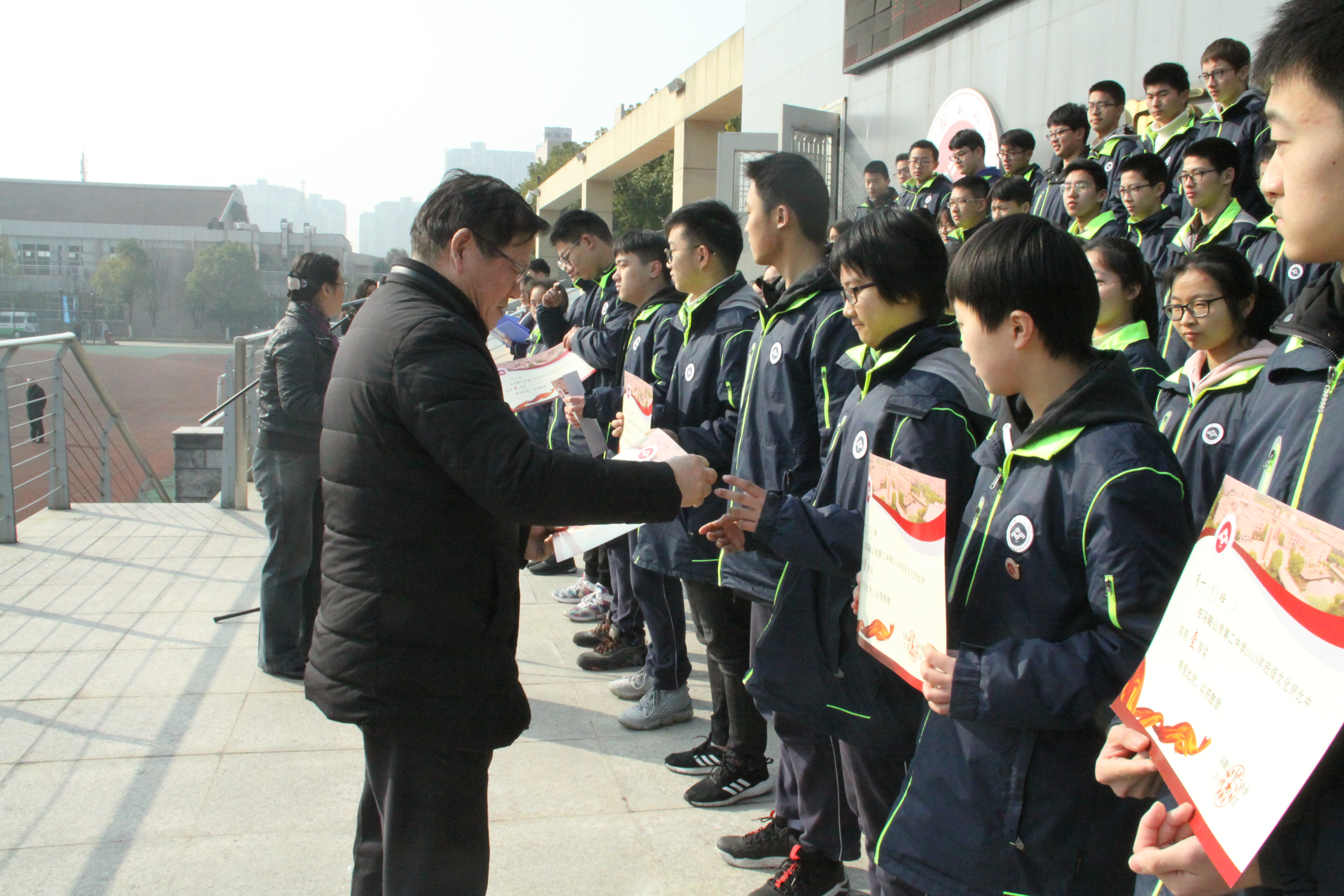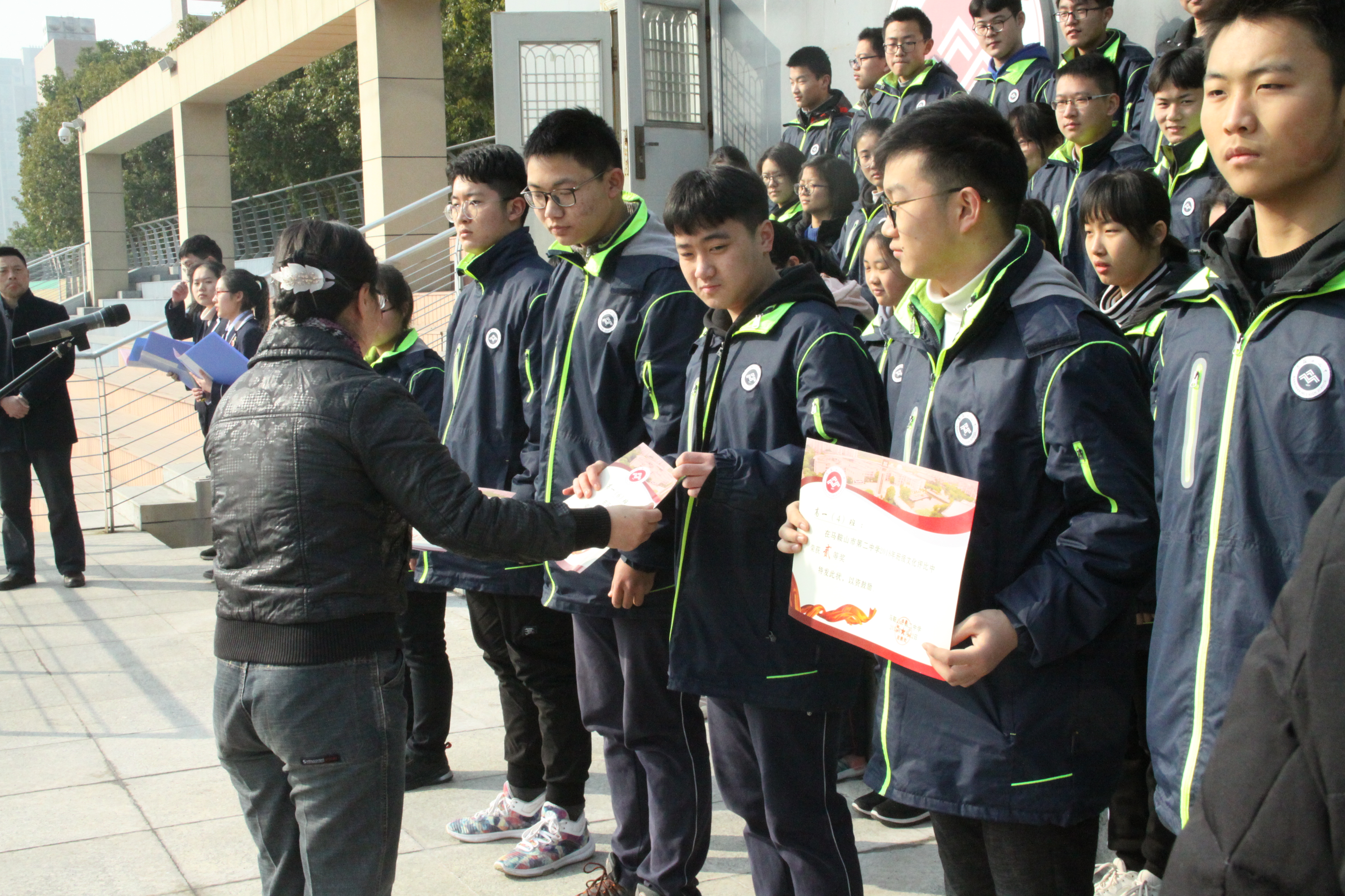 接下來是高一年級(jí)班級文化風采頒獎的環節,我校黨委書記聶曉霞、校長郭惠(huì)宇為獲獎班級頒獎(jiǎng)。這(zhè)張獎(jiǎng)狀不僅僅是對班級(jí)文化的肯定與表揚,更是對弘揚良好班風(fēng)進而構(gòu)建文明校園的(de)鼓勵。