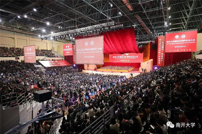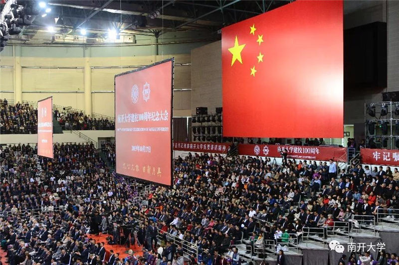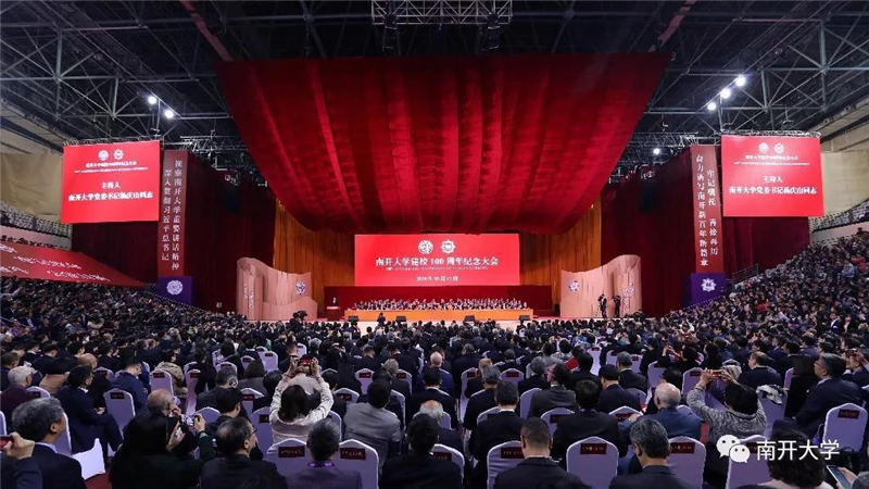 大中路(lù)紫緞飄揚,新開湖碧波蕩漾,迎來百年華誕的南開園處處洋溢著喜慶氛圍,煥發出勃勃生機。會(huì)場內,高高懸掛的巨型國旗鮮豔奪目,“深入貫徹習(xí)近平(píng)總書記視察南開大學(xué)重(chóng)要講話(huà)精神,牢記囑托,再接再厲,奮力譜寫南開新(xīn)百年新篇章”“不(bú)忘(wàng)初心,牢記使命,愛國奮鬥,公能(néng)日(rì)新”的標語振奮人心。主席台兩側徐徐展開的卷軸上,印刻著(zhe)南開大學百年來始終堅守的“允公允能,日新月異”校訓和“愛國敬業創新(xīn)樂群”優良(liáng)傳統。