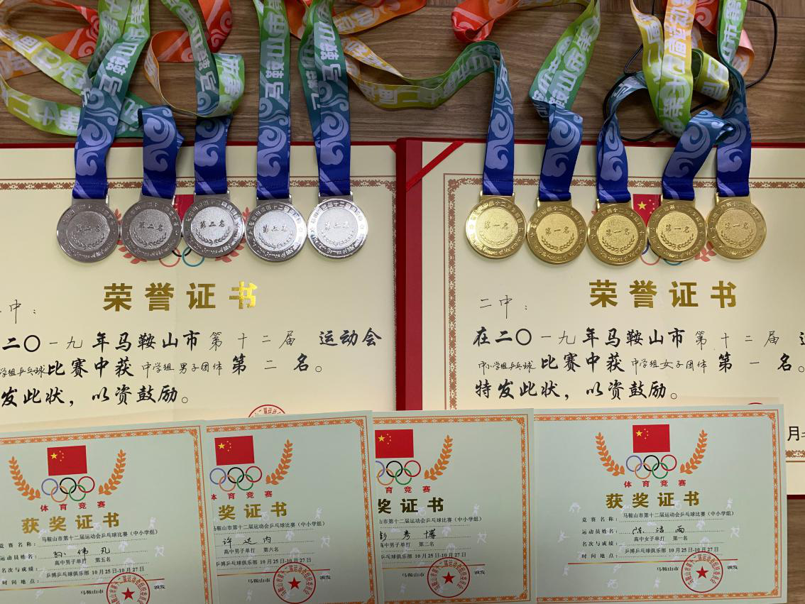 馬鞍山(shān)市第十二屆運動會(中小學組(zǔ))“科達杯”乒乓球比賽於2019年10月25—27日在乒博乒乓球俱樂部舉行。我校運動員在比賽(sài)中為學校的榮(róng)譽奮勇爭先(xiān),頑強拚搏,盡(jìn)顯(xiǎn)二中學子健(jiàn)康向上的風采,斬獲女子團體冠軍、男子團體亞軍(jun1)。陳潔雨獲女子單(dān)打第一,耿(gěng)笑珂獲女子單打第四名,彭彥博獲男子單打(dǎ)亞(yà)軍,孫偉凡獲男子單打第五名,許達內(nèi)獲男子單打(dǎ)第六名。