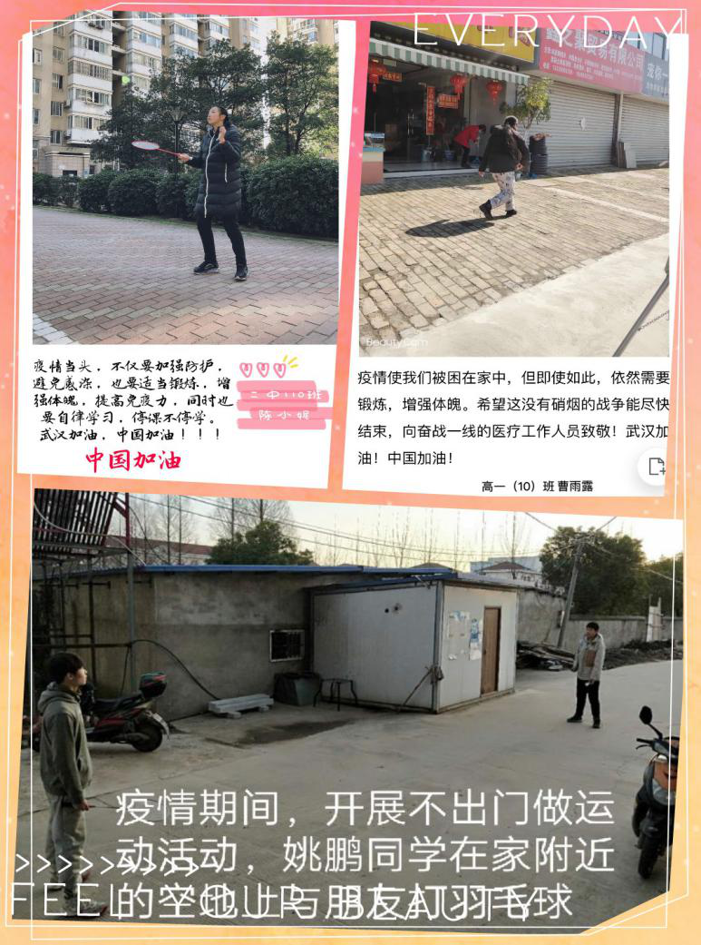 疫情期間,高一(10)班的同學們積極響應(yīng)國家(jiā)號召,以負責任的態度,待在家中進行隔離,最大程(chéng)度的減小自身被感染的風險,同時因地製宜開展健身活動,利用有限(xiàn)的條件進行(háng)鍛煉,踐行了主動健身,預防第一的健康生活方式,既增強了免疫力,又培養(yǎng)了自律的(de)好習慣。