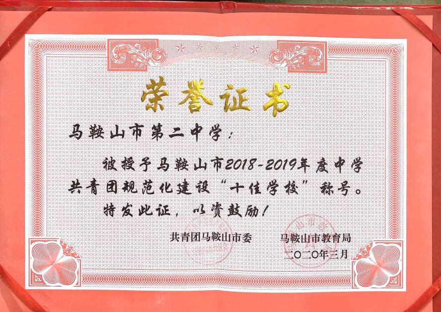 其中,我校獲評2018-2019年度中學共青團規(guī)範化建設“十佳學校”稱號,二中雛鷹(yīng)誌願者服務隊(duì)獲評2018-2019年度(dù)“馬鞍山市(shì)青年誌願者優秀組織”稱號。
