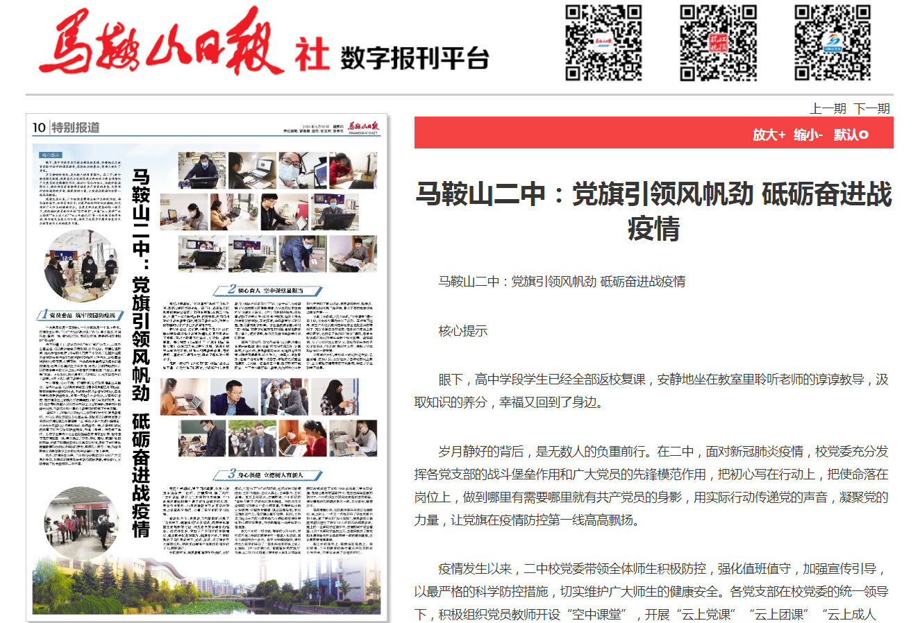 2020年4月30日出版的《馬鞍山日報》,以《黨旗引領風(fēng)帆勁(jìn) 砥礪奮進戰疫情》為題特別報道了我校黨委防疫(yì)抗疫工作。