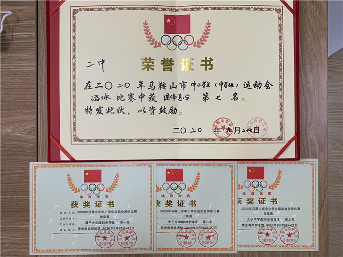 馬鞍山市中小學生運動會遊泳比賽於2020年9月26日(rì)—27日在黃金海岸遊(yóu)泳館成功舉辦。我校遊泳隊頑強拚(pīn)搏,穩(wěn)定發揮,榮獲中學組團體總分第七名(míng);陶奕君同學在男(nán)子中學組50米仰泳項目(mù)中獲得金牌,王陳晨同學(xué)在女子中學組50米蝶泳項目中獲得銀牌、50米自由泳項目中(zhōng)獲得銅牌。