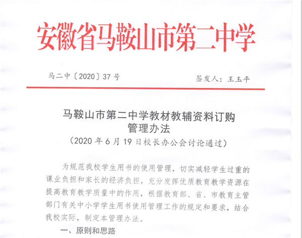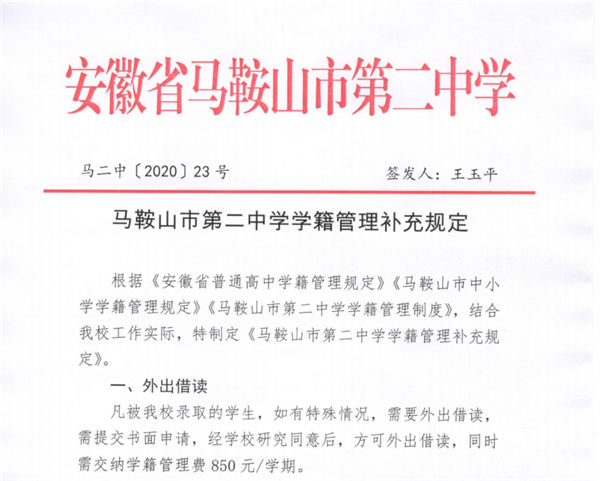 先後製(zhì)定(dìng)、修訂並施行(háng)《馬(mǎ)鞍山市第二中學關於借讀(dú)及轉學的規定(dìng)》《馬鞍山市第二中學學籍管理補充規定》《馬(mǎ)鞍山市第二中學教材教輔資料(liào)訂購管理辦法(fǎ)》《馬鞍山市第二中學教育集團內部人員交流任職管理實施辦法》《馬鞍山(shān)市第二中學財務報銷製度》《馬鞍山(shān)市第二中學(xué)資產管理(lǐ)製度》《馬鞍山市第(dì)二中學(xué)教師午休樓使用管理辦法》等多項(xiàng)規章製度。