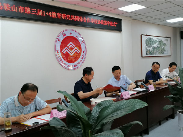2021年5月14日,第三屆“1+4教(jiāo)育研究共同體”合(hé)作學校簽字儀式(shì)在馬鞍山二中舉行,簽字(zì)儀式由馬鞍(ān)山二中教科處沈榮主任主持,沈榮主(zhǔ)任宣講了市教育局《關(guān)於公布馬鞍山市第三屆(jiè)“1+4”教育(yù)研究共同體名單的通知》,馬鞍山二(èr)中校長王玉平、當塗一中校長穀榮生、和縣一中副校長沈強、含山中學(xué)教科室主任戴德文分別代表學校簽訂(dìng)了合(hé)作協議書。穀榮生、沈強和(hé)戴德文分別代表(biǎo)共同體參與學校發言(yán),一致表示要在馬(mǎ)鞍(ān)山二(èr)中的帶領下,通過共同體(tǐ)合(hé)作學校的深度交流,推(tuī)動學(xué)校教育教學高質量發展。