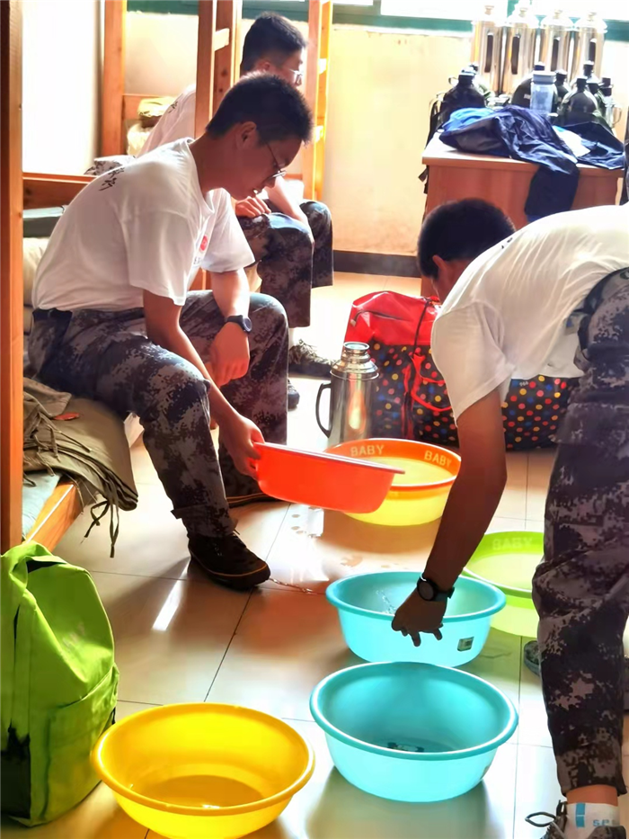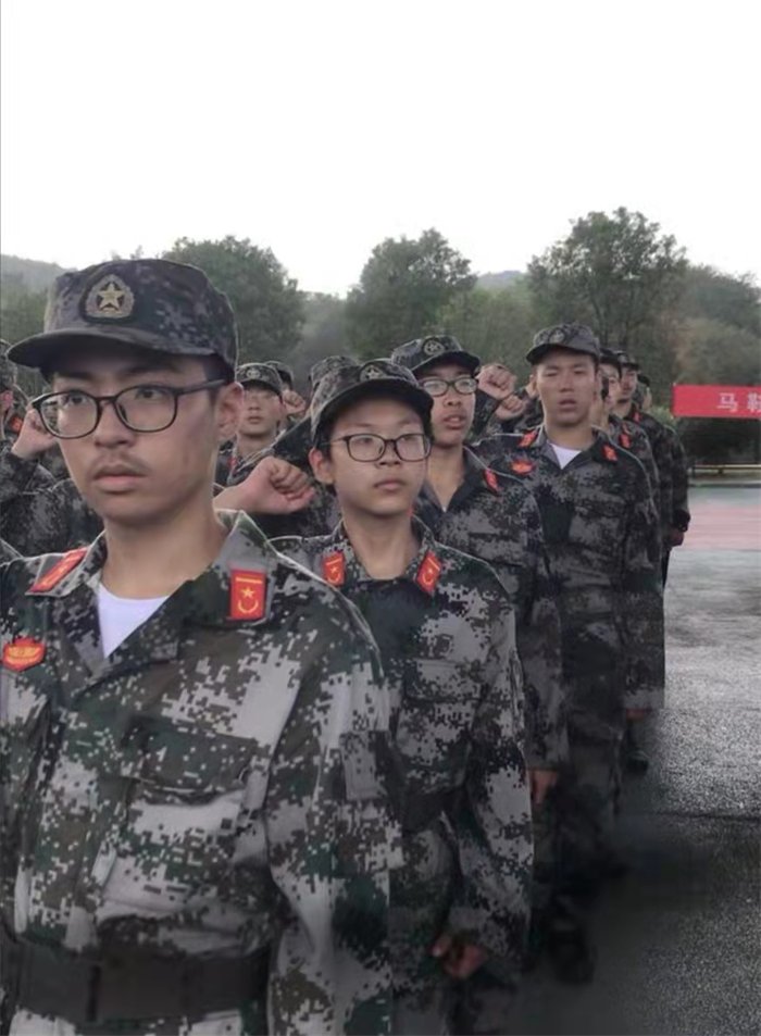 下午隊列訓練,軍姿轉體(tǐ),踏步走,一項項科目接(jiē)踵而至;晴空、暴雨交替進行;第一次穿解放鞋,久站後磨腳;汗水雨水交叉滲透,雙腿與雙臂酸(suān)痛沉重。然而,無一人抱怨訴苦,無(wú)一(yī)人輕言放(fàng)棄。