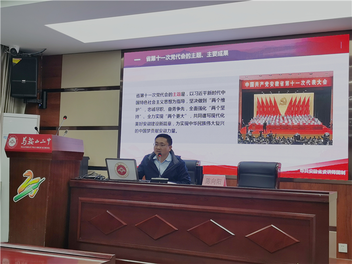 12月9日(rì)下午,市(shì)教育局黨委副書記、副局長陳向陽來我校宣(xuān)講省第十一次黨代會精神,第二黨支部全體黨員認真聆聽了(le)報告內容。陳向陽圍繞“省第十一次黨代會的主題、主要(yào)成果”、“過去五年全省發展取得的成就和經驗”、“現代化美好(hǎo)安徽建設的總體要求”、“今(jīn)後五年的主(zhǔ)要任務(wù)”、“縱深推進全(quán)麵從嚴治黨的要求”、“學習好宣傳(chuán)好貫徹好(hǎo)省第十(shí)一次黨(dǎng)代會精神”等六個方麵,結合教育係統實際工作,對省黨代會(huì)精神作了深入解讀和係統闡釋。