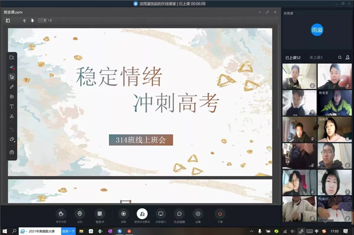 為了進一步做好疫情防控(kòng)宣傳(chuán),全麵了解學生學習情況和思想動態,加(jiā)強班級管(guǎn)理,增強班級凝聚力,3月21日下午,我(wǒ)校各班班(bān)主(zhǔ)任與學生、家長們齊聚屏幕前,互動交流,開(kāi)展了一(yī)次與眾不同線上(shàng)主題班會活動。