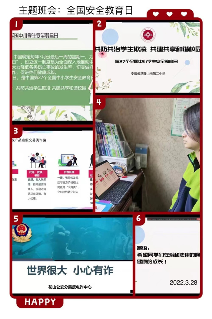 為全麵深入地推動中小學生安全教育工作,大(dà)力降低各類傷亡事故的發(fā)生率,切實做好中小學生的安全保護工作,促進他們健康成長(zhǎng),自1996年起我(wǒ)國確定(dìng)每年3月份最後一周(zhōu)的星期一為全國中小學生“安(ān)全教(jiāo)育日”。今年3月28日是我(wǒ)國第27個“全國中小學生安全教育日”,我校(xiào)於周一下午開展了以安全教育為主題的“雲上”班會。