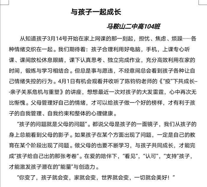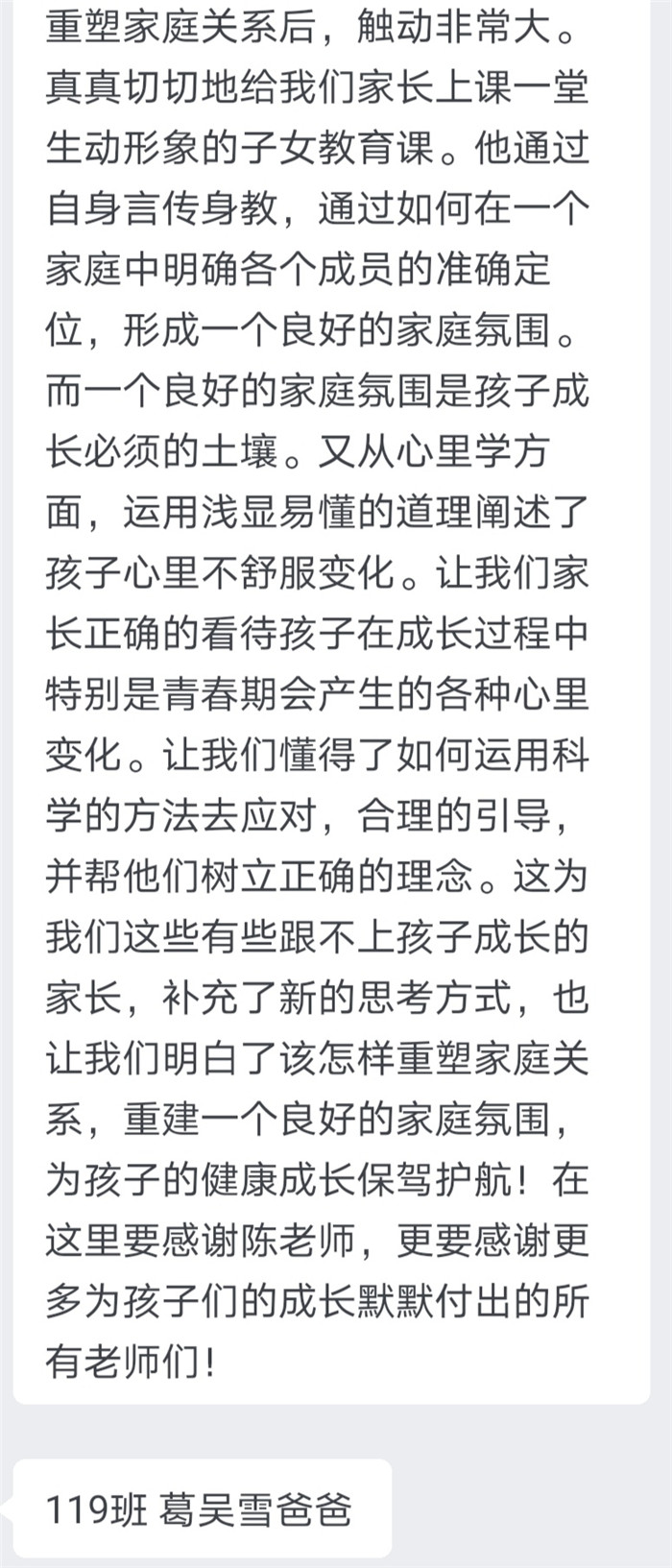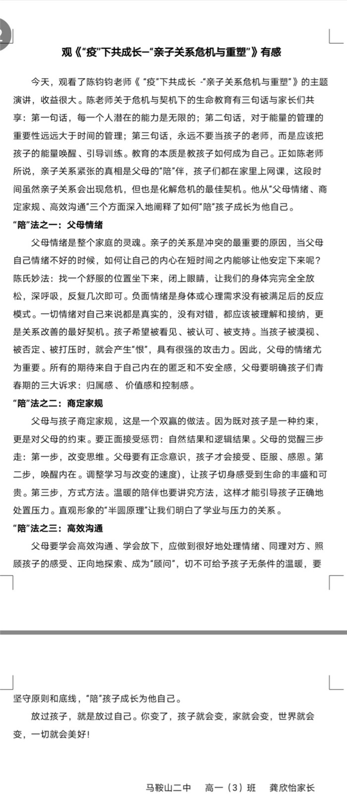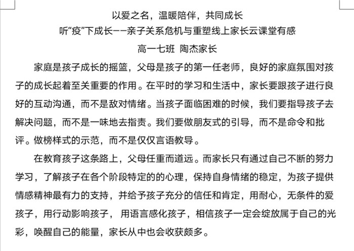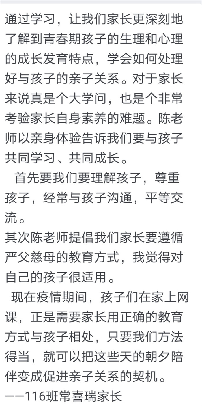 本次“紅星大講堂(táng)”線上家長培訓活動不僅有(yǒu)利於營造良好的家校共育氛圍,還能幫助家長們更新(xīn)家庭教育觀念、掌握家庭教育的現代(dài)科學知(zhī)識和方法,對營造適宜青少年健康成長的(de)家庭教育環(huán)境具有重要意義。在這樣一個(gè)學生居(jū)家上課(kè)的特殊時期,這堂為家長們特別定製的“網課”恰(qià)似一(yī)場“及時雨”,家長們紛紛(fēn)表示受益匪淺,並(bìng)與我(wǒ)們分享了他們的心得體會。高一(9)班(bān)一位家長表示將“堅定必勝信心,全力支持配合,共同守(shǒu)護孩子,一起迎接春暖花開的早日到來”。