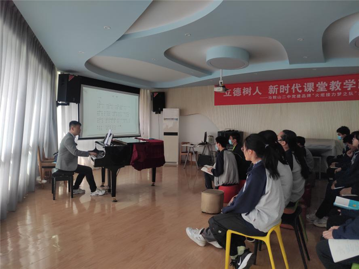 馬鞍(ān)山二中火炬(jù)接力課(kè)堂教學周音樂匯(huì)報課於2022年5月12日上午第二、三兩(liǎng)節課在校藝術中心舉行,授課老師分別由博望分校的屈海(hǎi)兵老師(shī)和鄭蒲港分校的陳亞琦老師,二(èr)中黨委副書記聶曉(xiǎo)霞、工會(huì)主席畢小(xiǎo)紅、市音樂教研員李善忠老師以及全市三區三縣的高中音樂教師共二十多人參加了聽課、評課交流活動。