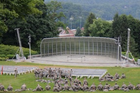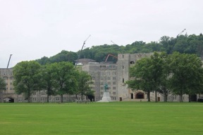 兩個小時的車程,在一座安(ān)靜小鎮(zhèn)的背後,西點來到(dào)了91视频网站麵前。哥特式的建築,古樸的小(xiǎo)木屋,流露著一種威嚴(yán),一份靜謐,也許(xǔ)隻有在這茵茵綠地,淡淡湖水中,才可以養育出(chū)一批傑出的(de)將領吧。