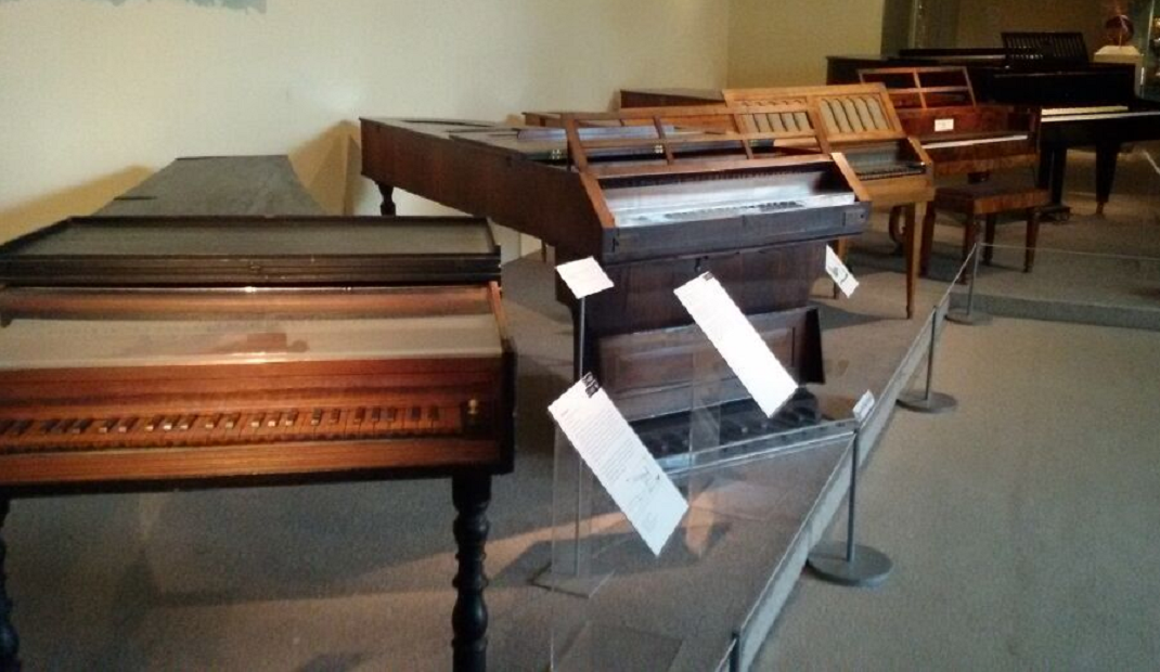 我流連於如此多架精美古老而偉大的鋼琴前,輕戳Audio, 傾聽回(huí)旋音符,感受我的心之共鳴。原(yuán)來年紀最大的鋼(gāng)琴的音色跟吉他(tā)很像,沒有踏板,不能演繹較長的音,難(nán)道也是通過撥(bō)弦發聲的麽?來自1720年的她也許真的太老了,大概打不開,也看不到內部具體構造了吧。往前走,十八世紀末的鋼琴映入眼(yǎn)簾,音色跟現代的差別不大(dà),讓我覺得好笑的是白鍵和黑鍵的顏色是(shì)反的,黑鍵當時(shí)是(shì)白(bái)色,白鍵居然是黑的!像一塊塊巧克(kè)力拚起來其間點(diǎn)綴這白色奶油(yóu)。踏板有(yǒu)n個,不過琴蓋裏(lǐ)的毛氈(zhān)子出(chū)現了。直到十九世紀中期黑白鍵的顏色(sè)順序才和(hé)現在相同,通過展品(pǐn)旁的介(jiè)紹圖來看發聲結構卻比現在複雜的多,踏板減少到四個(gè),Audio展現(xiàn)出的音色越來越棒,外(wài)形不斷(duàn)完善美觀。從未有過這樣的體(tǐ)驗和震撼,從一個個展(zhǎn)品物件和耳畔旋律的交錯間,我竟觸摸到曆史的流淌,感(gǎn)受到源源的時間交響樂。