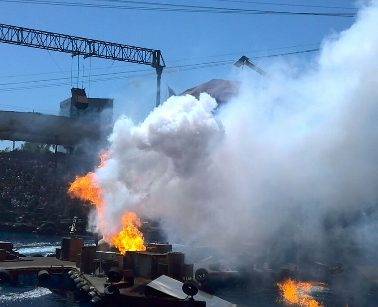 後來還觀(guān)看了經典的水世界表演。它講述了未來(lái)世界成為水(shuǐ)世界,為了找到僅(jǐn)存的大陸,男女(nǚ)主角與海盜展開了激烈搏鬥的過程。整個過程貫穿了各種電影特效。摩托艇、遊艇、飛機、大炮、重機槍在整個場景內打得(dé)濃煙四起,不亦樂乎,給人以視覺和聽覺上的(de)強烈衝擊。