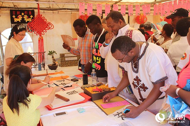 下午一(yī)點半的時(shí)候,中國駐南非大使及夫(fū)人到(dào)達了(le)展棚。他們看到:徐老師在打太極,圍觀群(qún)眾(zhòng)眾多;一位寫好了自己中文(wén)名字的外國人剛擠(jǐ)出了隊伍,他興高采烈地(dì)對著大使就練起了剛(gāng)學的漢語“謝謝!你好!我很高興”。 大使非常開心,當場(chǎng)就邀請他寫(xiě)了一張南非中國(guó)年的slogan。在活動結束之後,大使還特意打電話過來,對我(wǒ)們的工作做出了高度評價(jià)。