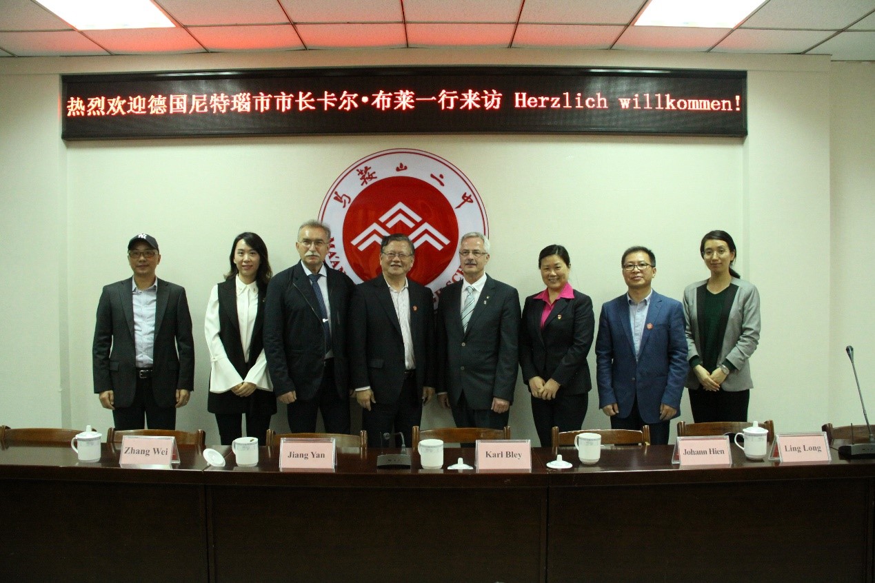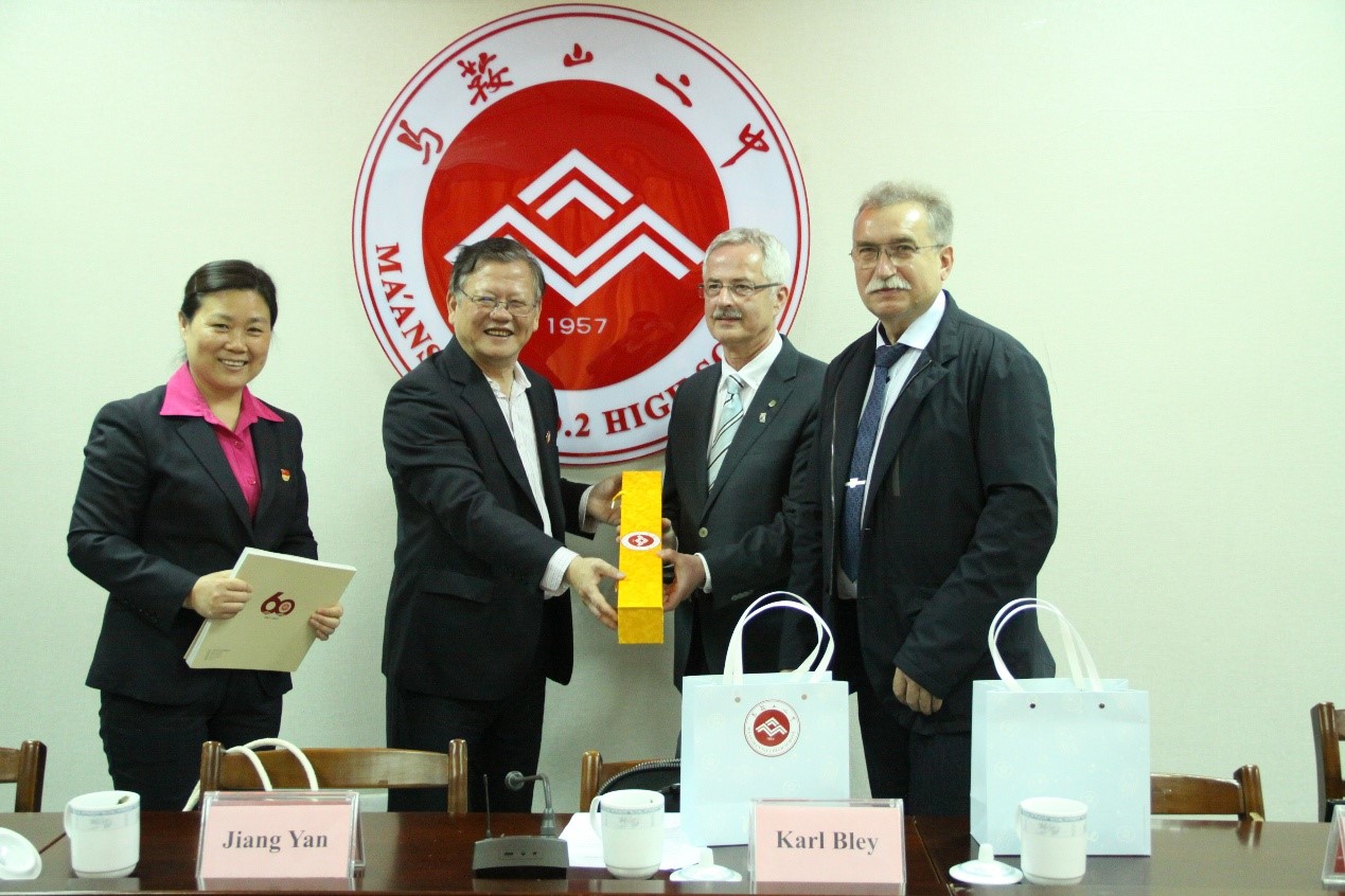 4月23日下午兩點半,德國尼特瑙市市長卡爾•布萊、德國上(shàng)普法爾(ěr)茨地區對外友好協會(huì)會長漢斯•希恩、歐中經濟(jì)文化促進聯合會秘書長淩龍、事務部副部長張薇一(yī)行,在市政府辦外事服務科科長蔣燕的陪同下來馬鞍山二中(zhōng)參(cān)觀考察。我校(xiào)在行政樓一樓會議室召開了歡迎會,校長郭惠宇、校黨委(wěi)書記聶曉霞、副校長王玉平(píng)、國際部老師、英語教研組組長方靜老師蒞臨(lín)參會。