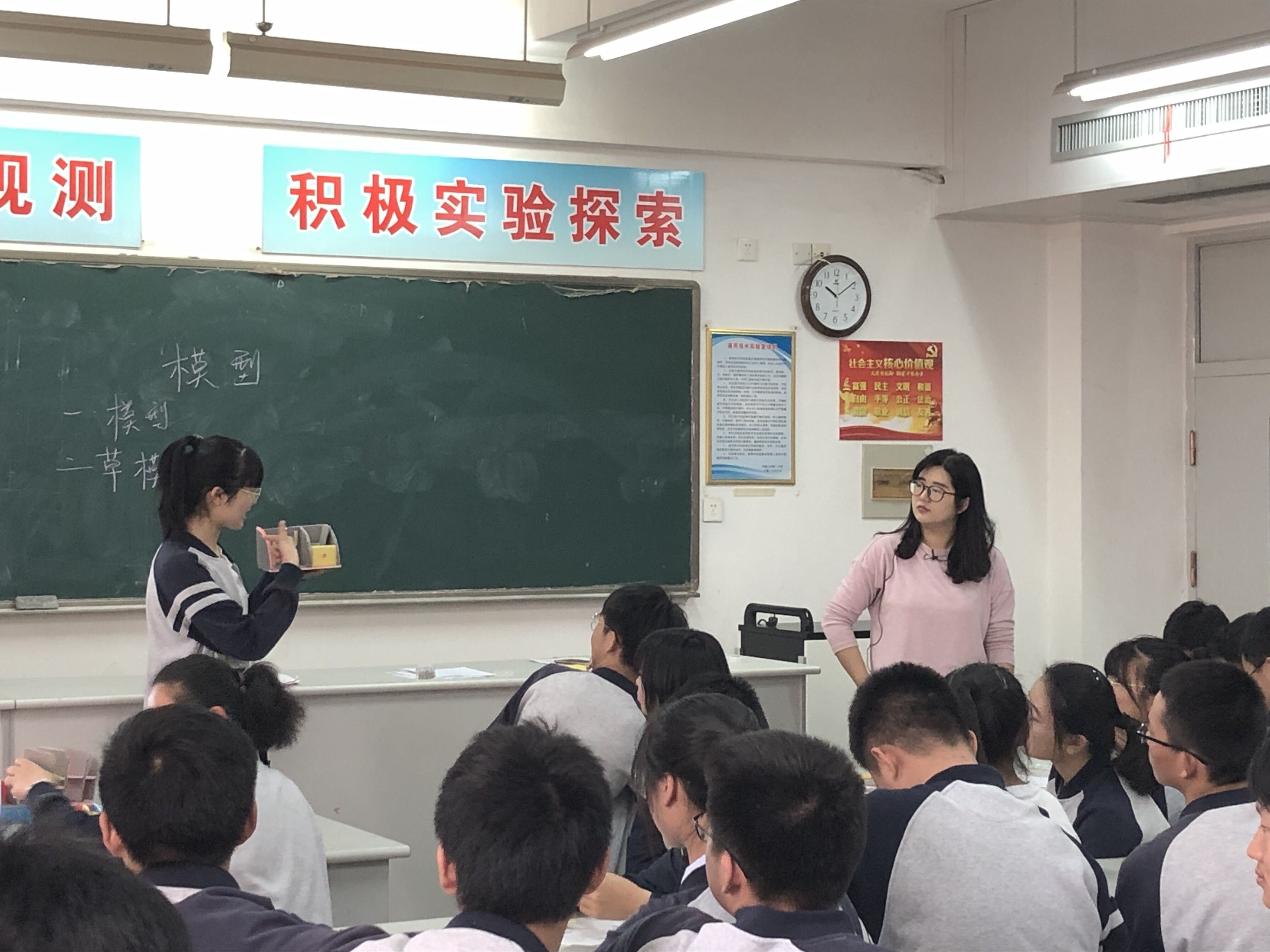 費蕊蕊老師帶來的是一堂活動課,主題是《模型》。通過微視頻引入課題,並由(yóu)此總結出模型的概念以及作用。緊(jǐn)接著,開展了利用吹(chuī)塑紙製作草模的活動。在整個動手“做”的過程中,教師對於(yú)學(xué)生的指導以及學生對於模型的進一步認知,體現了通用技術學科核心素養“物化能(néng)力”在(zài)教學中(zhōng)的落實(shí)。課堂的最後環節是學生分享自己的作品,其他同學對作品的改進提出建議,以及教師的點評和總結。通過本節課,學生不僅體驗了模型的製作,而且對通用技術課程學習的興趣進一步提升,課堂目標(biāo)達成。