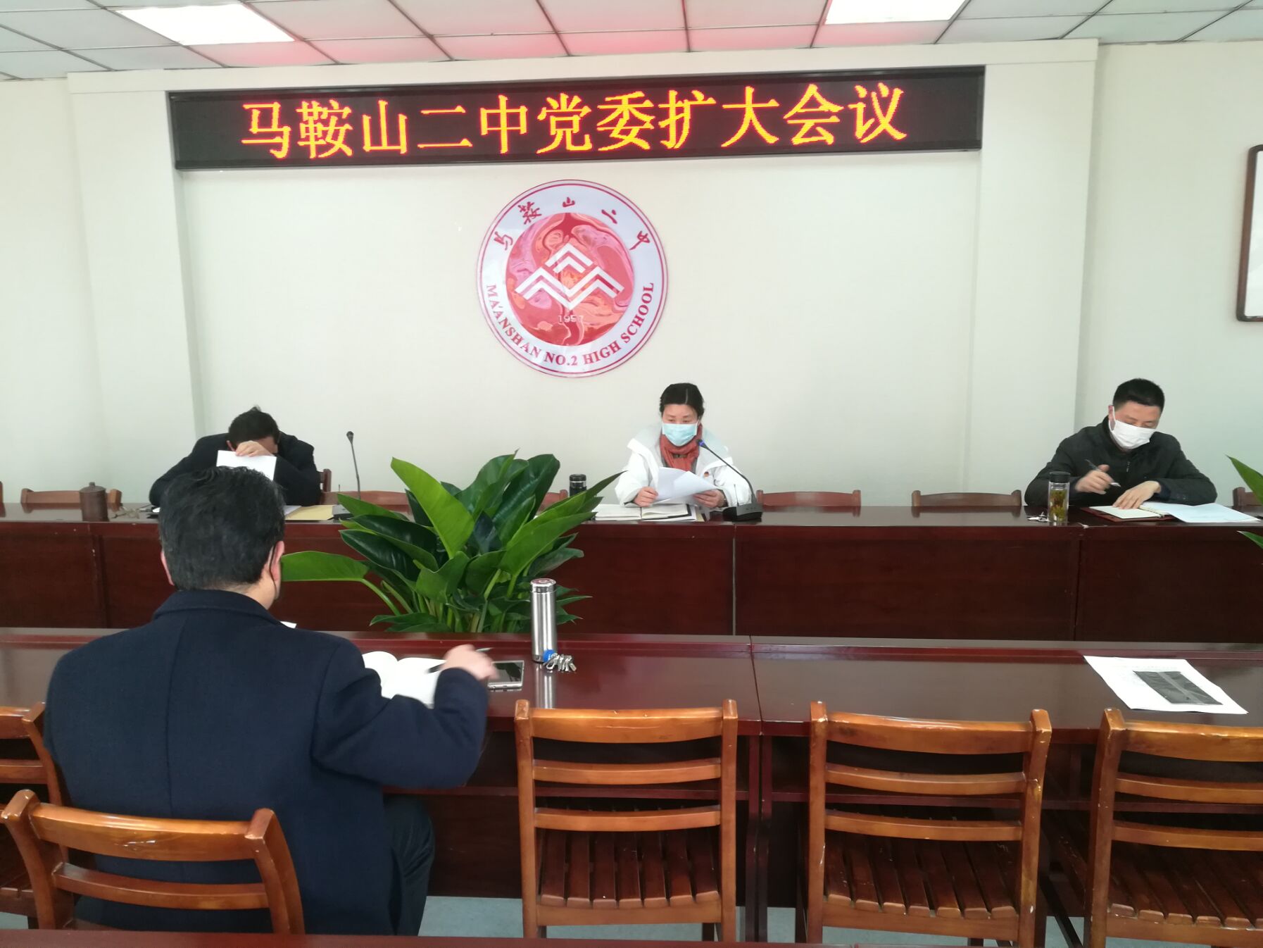 3月12日,馬(mǎ)鞍山二中黨委在行政樓一樓會議室(shì)召開黨委(wěi)擴大會議。黨委書記聶曉霞(xiá)主持會議,學校黨委委員、各支部書記、學校中層(céng)以上黨員幹部參加(jiā)了會(huì)議。