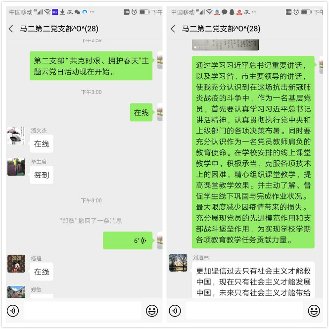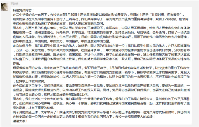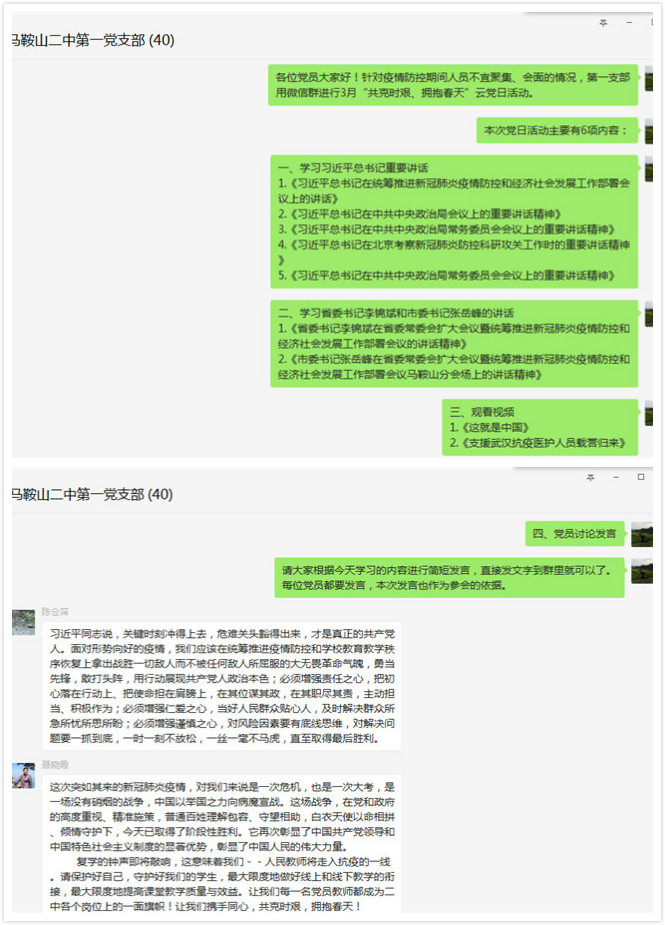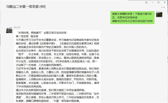 3月30日下午3點,馬鞍山二中黨委下屬各(gè)黨支部同時開展“共克時艱 擁抱春天”主題雲黨日活動。