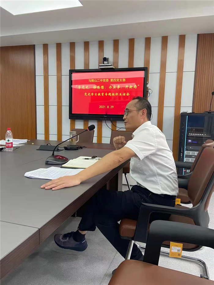 8月29日上午(wǔ),馬鞍山二中黨委第四支部全體黨員在三樓會議室召開了(le)黨史學習教育專題組織生活會(huì)。校黨史學習教育巡回指導組成(chéng)員、工會(huì)主席畢小紅與會(huì)指導。會議首先由校黨委委員、副校長,第四支部書(shū)記慶(qìng)曉代表(biǎo)支部(bù)委員會向黨員作了半年來黨支部工作(zuò)情況的報告,並通報了8月26日支委會上(shàng)檢視的問(wèn)題情況。黨支部副書記朱家讀領學(xué)了習近平總書記在慶祝中國共(gòng)產(chǎn)黨成立100周年大會上的重要講話精(jīng)神和習近平總書(shū)記考察安徽重要講話精神。