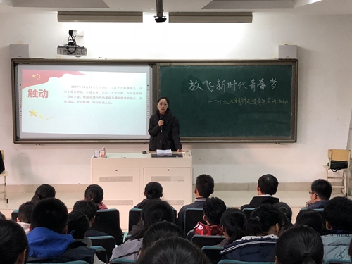 黨的十九(jiǔ)大勝利閉幕以來,全國上下掀起了一輪學習宣傳貫徹黨(dǎng)的十九大精神的熱潮。根據團市委統一部署(shǔ),128日下午,市青年宣講團(tuán)成員(yuán),市職業技術學院教師陸玲來到我校,為我校高103班和高219班兩個文科班學(xué)生帶來放飛(fēi)新時(shí)代青春夢——十九大精神走進(jìn)青年專題宣講(jiǎng)報告。