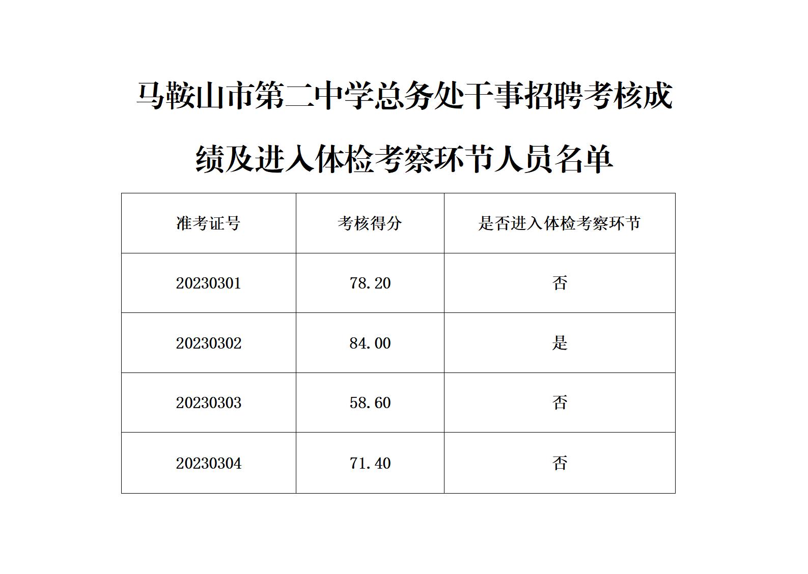 馬鞍山市第二(èr)中學總(zǒng)務處幹(gàn)事招聘考核成績(jì)及(jí)進入體檢考(kǎo)察環(huán)節人員名單