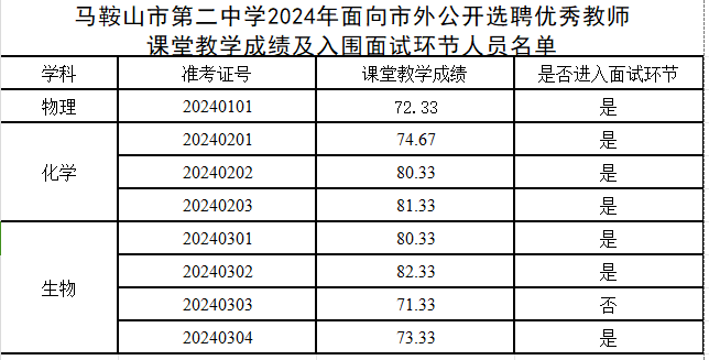 馬鞍山(shān)市第二中學2024年麵向市外公開選(xuǎn)聘優秀教師 課堂教(jiāo)學成績及入圍(wéi)麵試環節人員名單