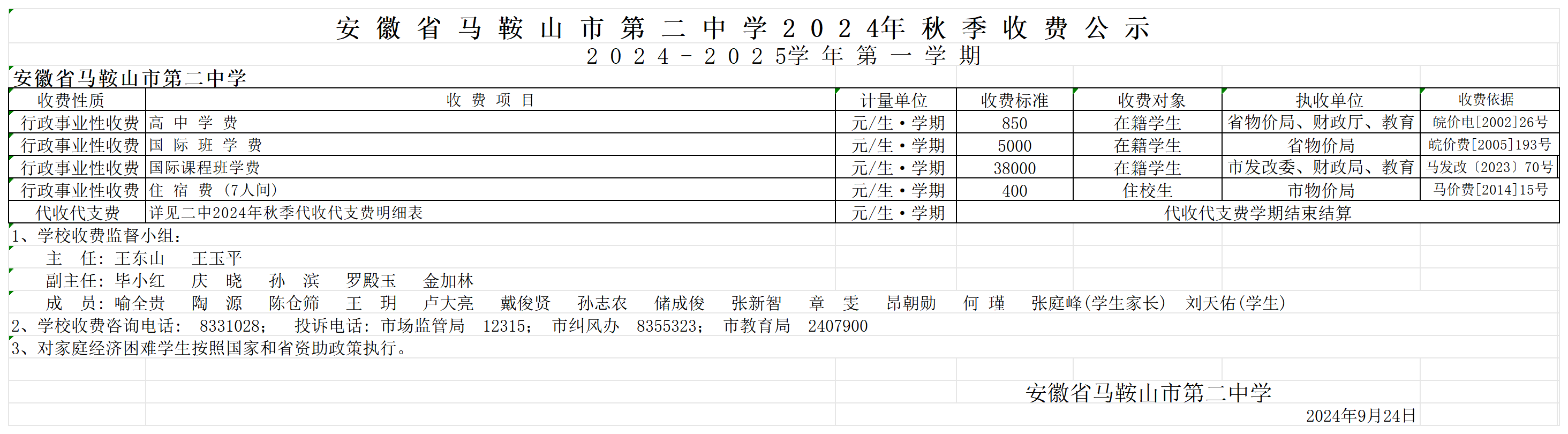 安徽省馬(mǎ)鞍山市第二中學2024年秋季收費公示