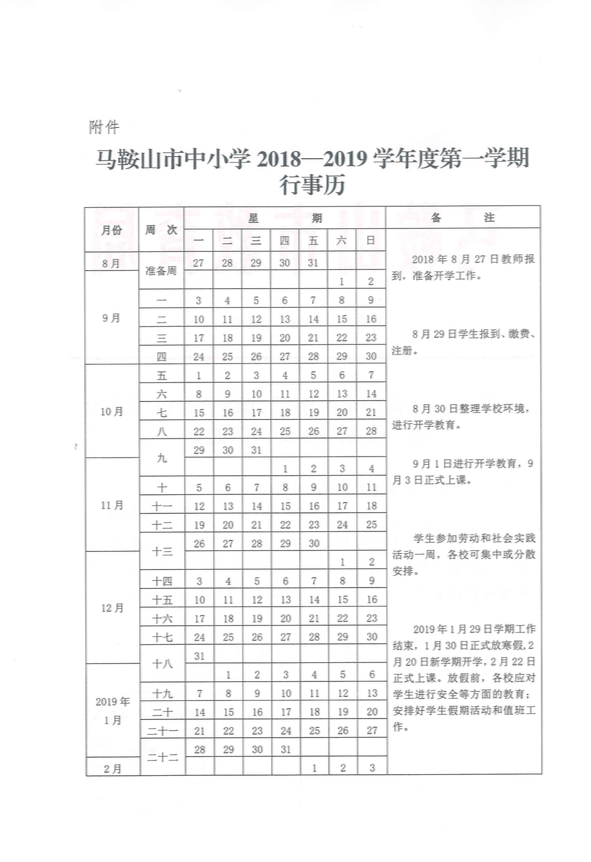 馬鞍山二中(zhōng)2018年-2019年學年度第一學期行事(shì)曆