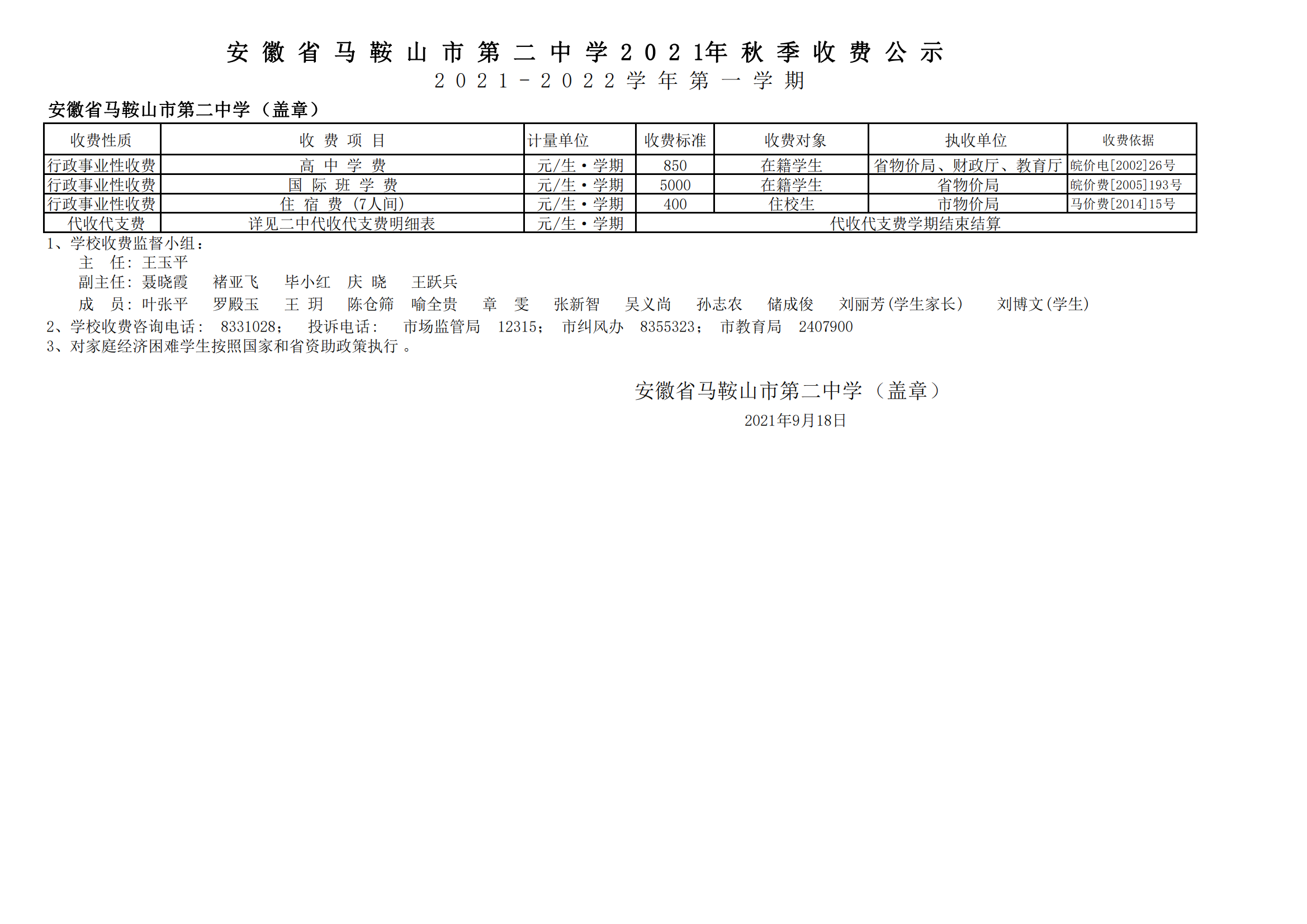 安徽省馬鞍山市第二中學2021年秋季收費(fèi)公示