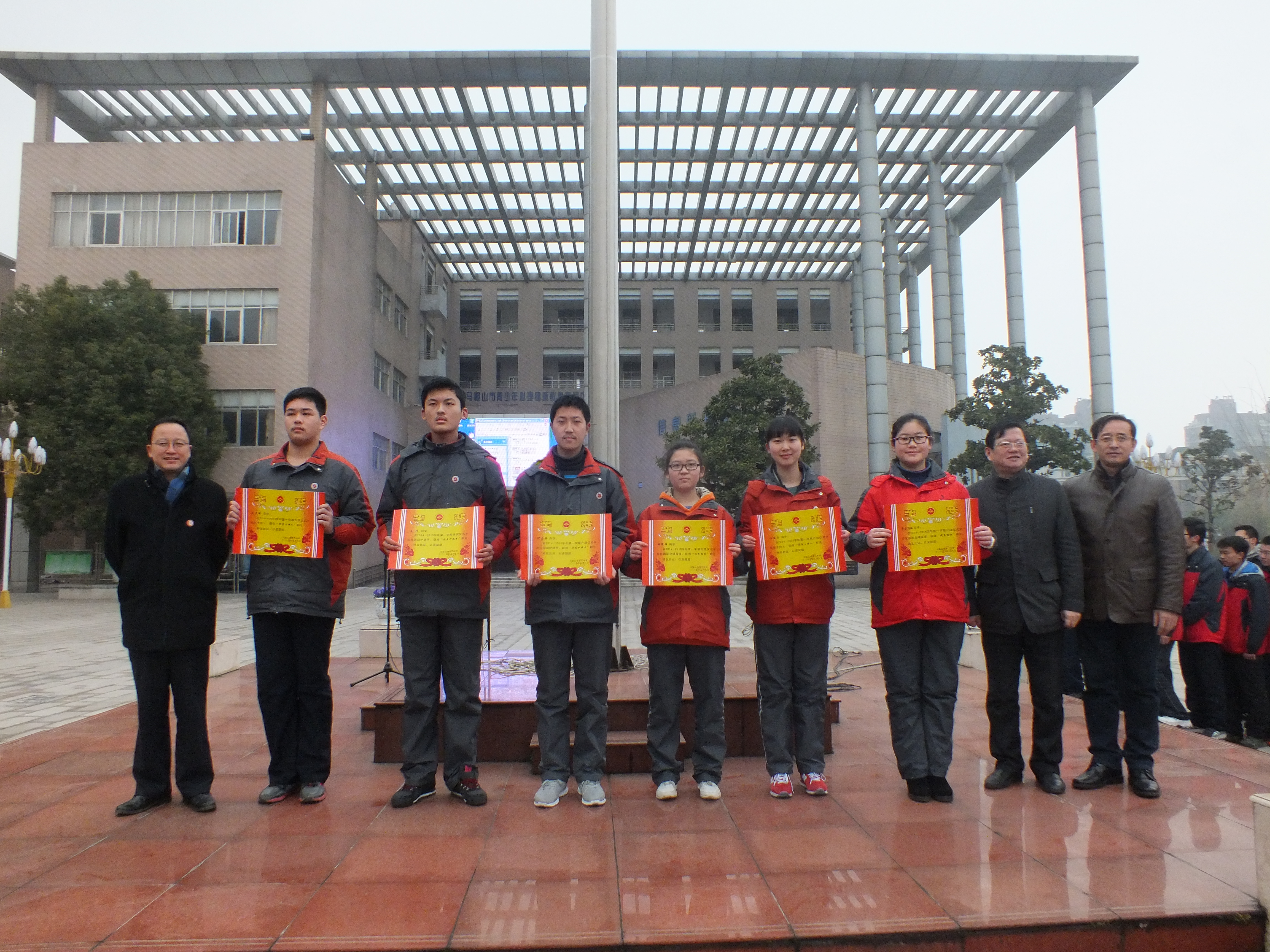 校領導為在2014——2015學年第一(yī)學期升旗儀(yí)式(shì)中獲獎同學頒獎。