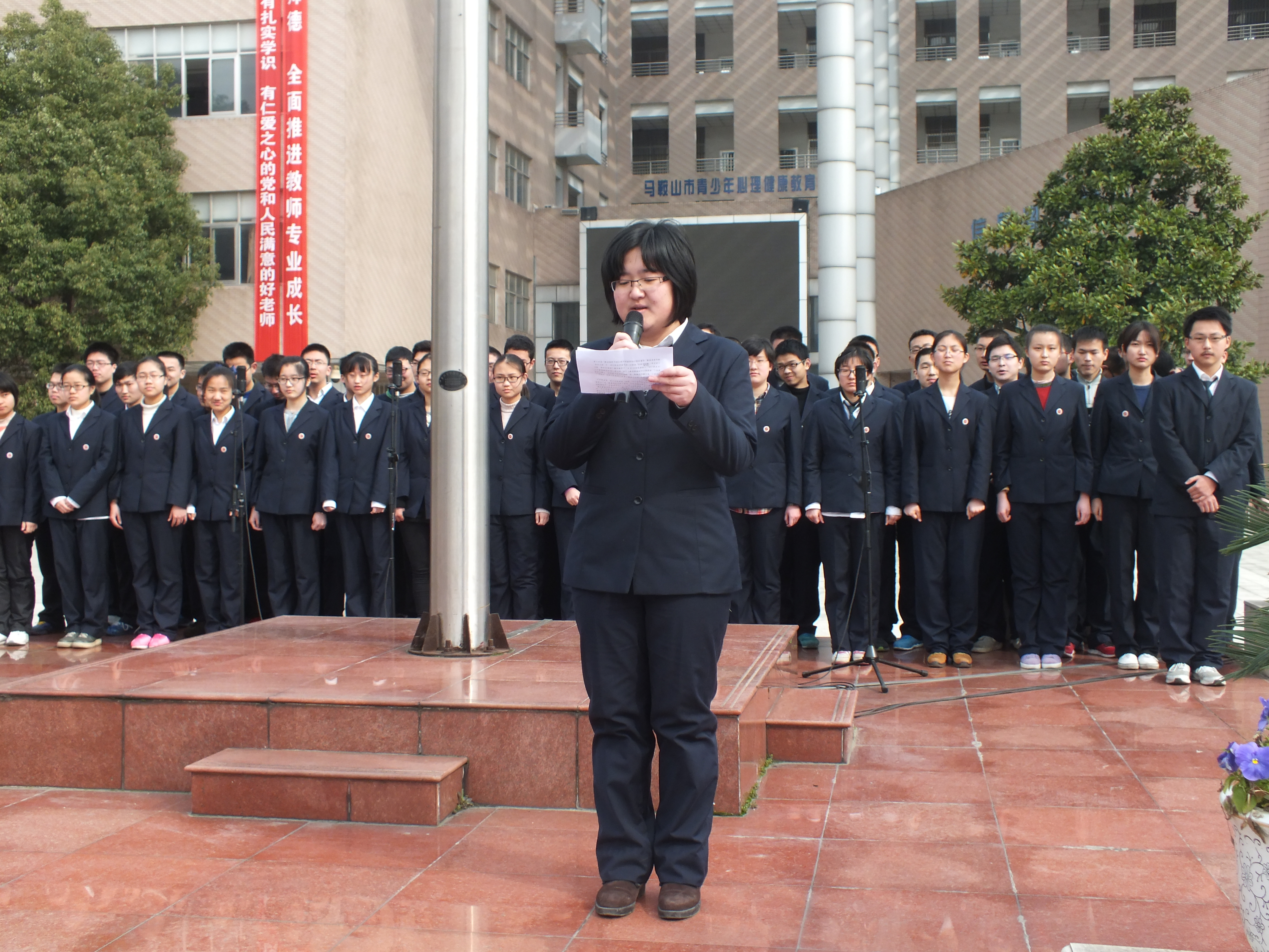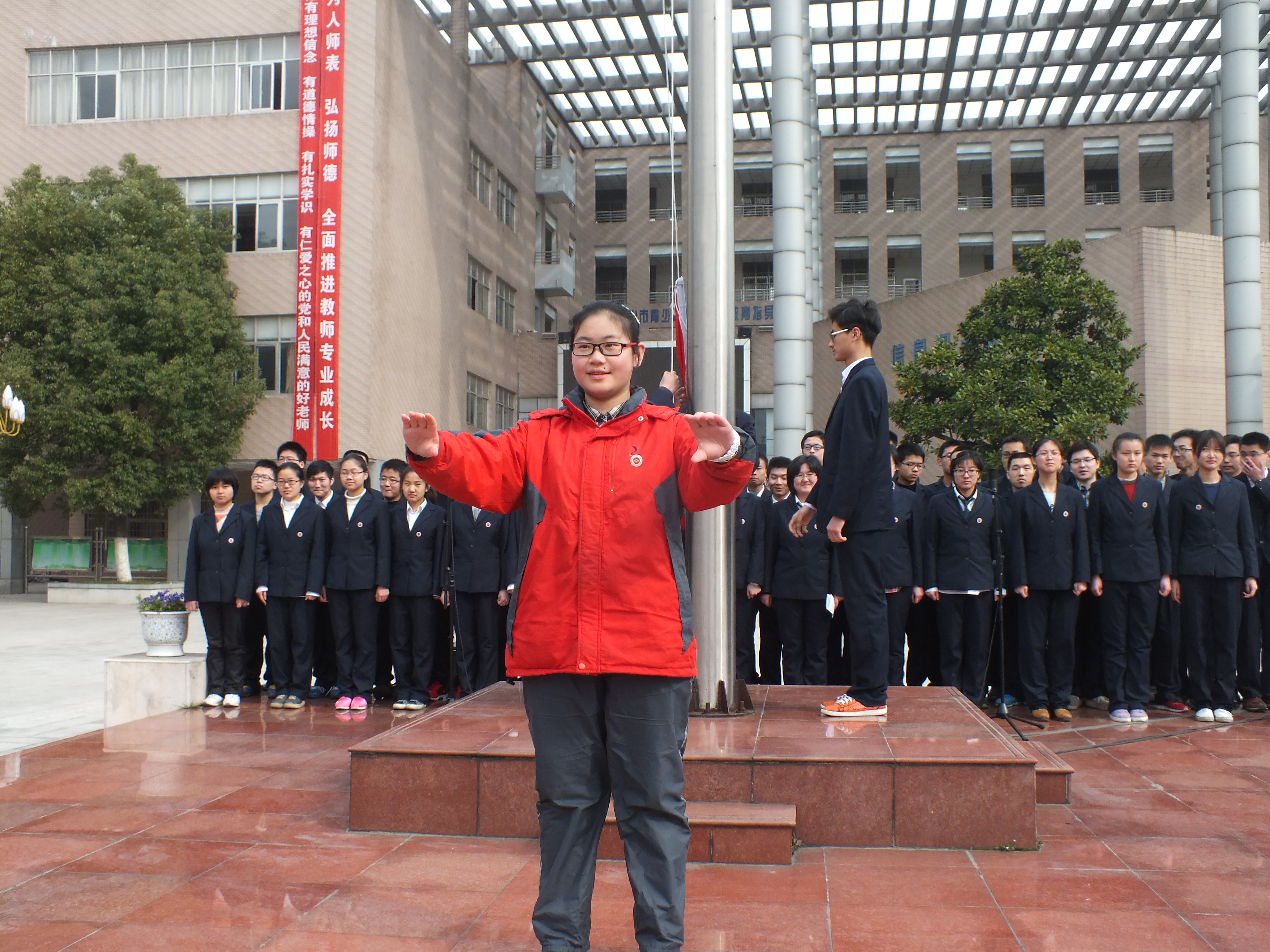 國旗下講話:2013-2014年度校“優秀學生幹部”、曾獲得全國英語競賽國家二等獎、“語文報”杯全國作文競賽省級三等獎,高三(2)班班長賀佳(jiā)琦同學。