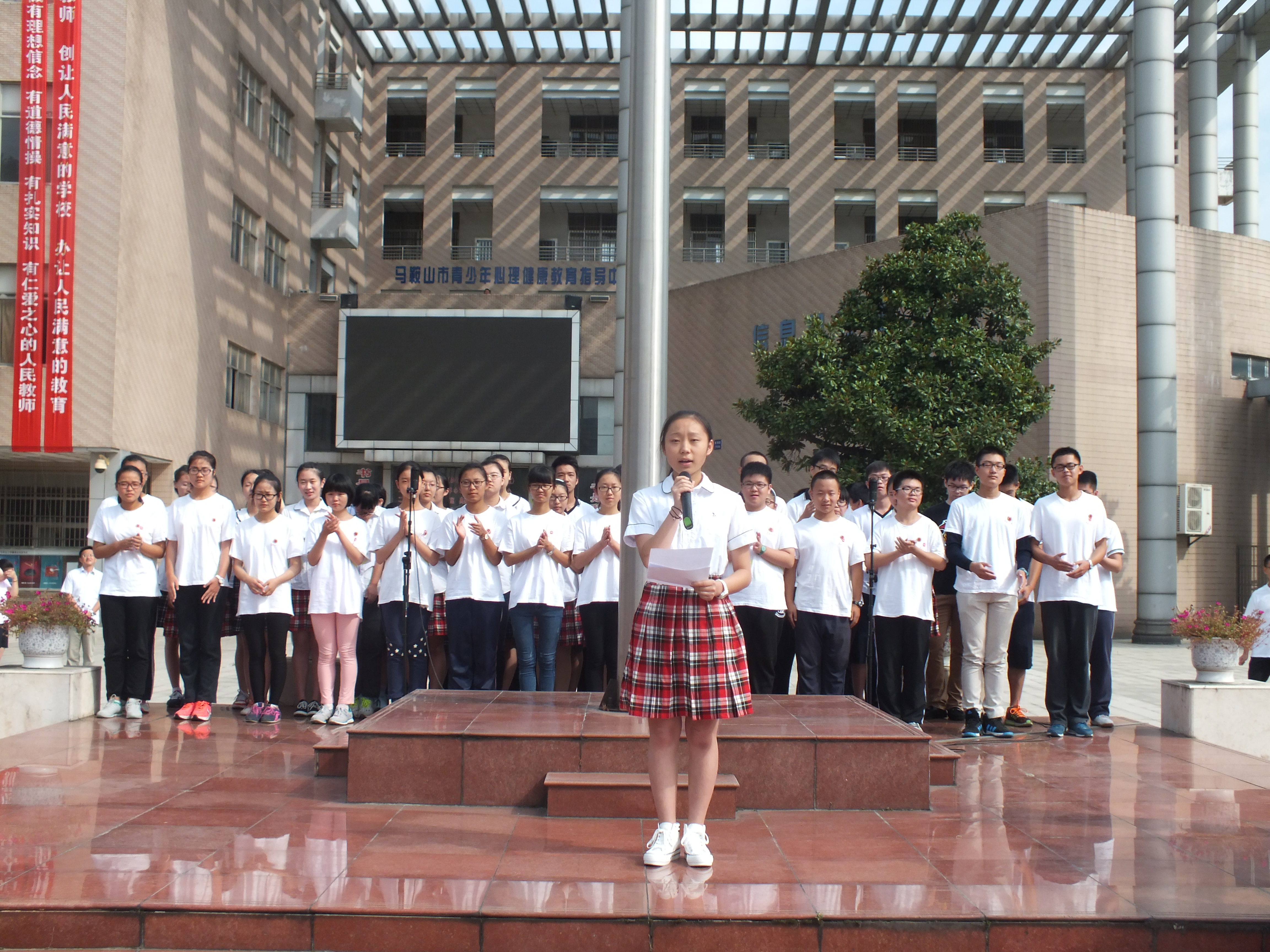 國旗下(xià)講(jiǎng)話人:高二(6)班的學生資助委員湯安琪同學。