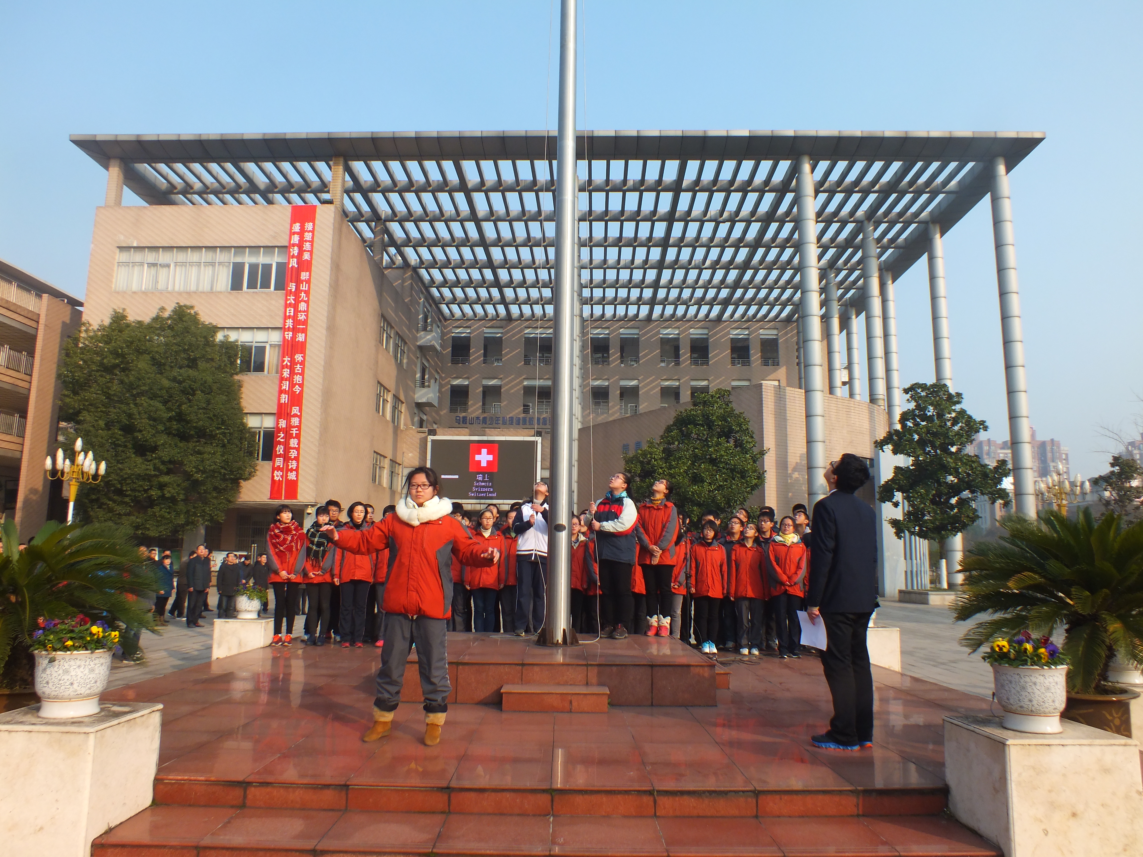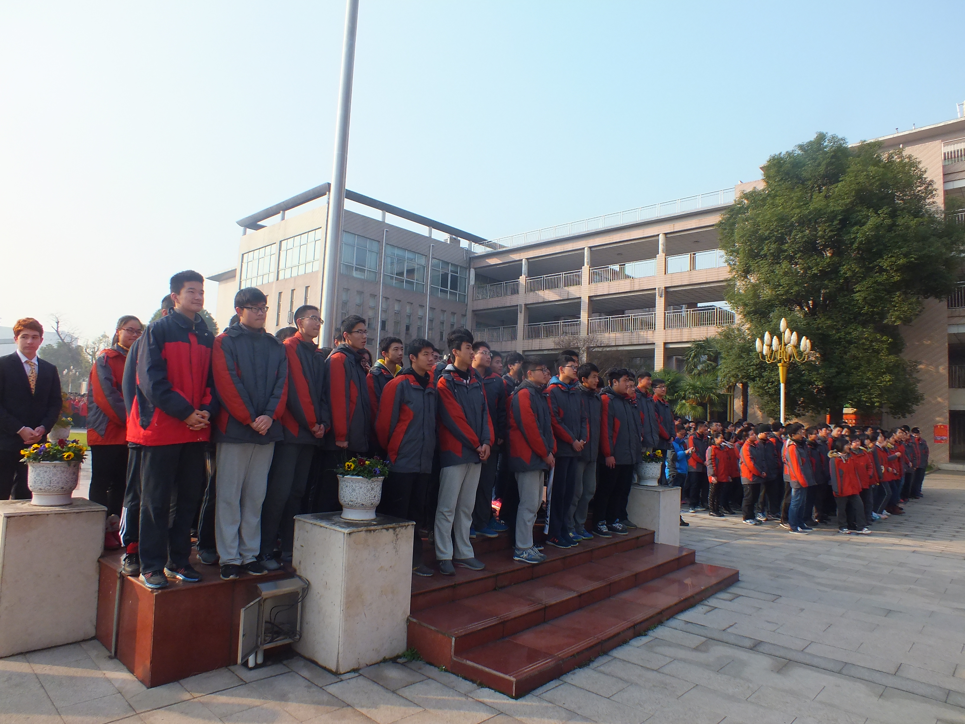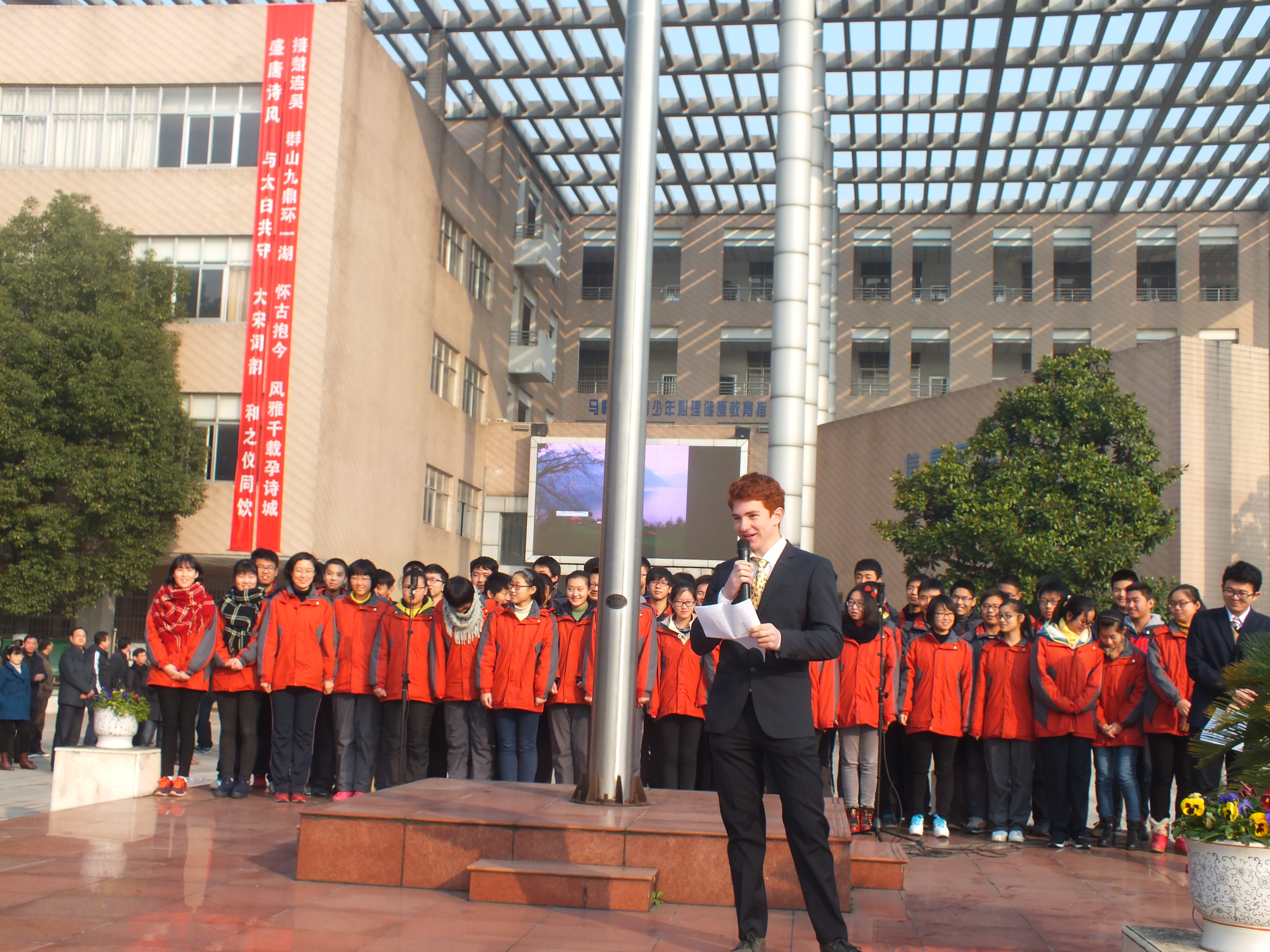 I am very honored to stand here today. I am also very happy to tell you some things about my experience here until now. My name is Luca and I’m from Switzerland. My hobbies are rowing, reading, running, skiing and playing the trumpet. I am 15 years old. I have now spent 3 months in China and about these three months I want to talk a bit.