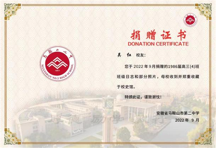 時逢二中建校65周年之際(jì),來自全國的校友們,紛(fēn)紛以各種形式為母(mǔ)校送上最真摯的(de)祝福!校(xiào)友吳紅捐贈了1986屆高三(四)班班(bān)級日誌和部分(fèn)照片,校(xiào)友丁一凡(fán)捐贈(zèng)個人專輯《月光下的歌》……母校的發展離(lí)不開廣大校友的關心和支持,校(xiào)友是母校發展(zhǎn)的參與者和見證者,是母校的寶貴財(cái)富,是母校的光榮與驕傲,希(xī)望校友(yǒu)們繼續為母校賦能(néng)、助(zhù)力,常回母(mǔ)校看看!