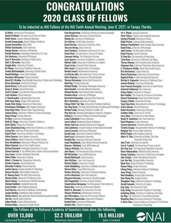 美國東部(bù)時間12月8日,美國國家發明家科學院(National Academy of Inventors,NAI)公布了2020年新當(dāng)選院士名單,今年共有175位學術發明人當選,其中,有包括我校1989屆校友程建軍在內的(de)20位華人學者當選。今年新當選的院士已(yǐ)擁有美國授權專利超過4700項,涵蓋了生物醫學工程,計算機工程,材料科學和物理學等領域。