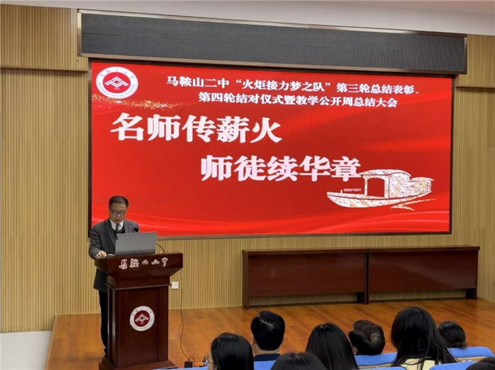 2025年10月31日下午,馬鞍山二中在行(háng)政(zhèng)樓二(èr)樓報告廳召開“火炬(jù)接力夢(mèng)之隊(duì)第三(sān)輪總結(jié)表彰(zhāng)、第四輪結對儀式暨教學公開周總結大會”。會(huì)議以“名師(shī)傳薪火,師徒續華章”為主題(tí),副校長孫濱主持,全體教(jiāo)職工參會,議程緊湊有序、內容(róng)充實,旨在總結過往經驗、開啟師徒共進新程、深(shēn)化(huà)課堂教(jiāo)學研究。