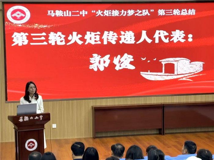 第三輪火炬傳遞人代表郭俊老師上台發言,結合(hé)自身(shēn)參(cān)與師(shī)徒幫扶的經曆,分(fèn)享(xiǎng)教學實踐中的成(chéng)長感悟、心(xīn)得收獲(huò),傳(chuán)遞“傳幫帶”的責(zé)任與擔當。