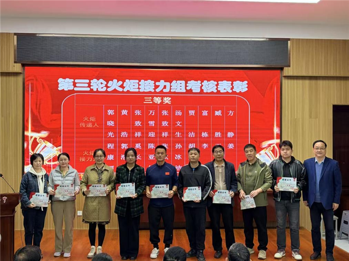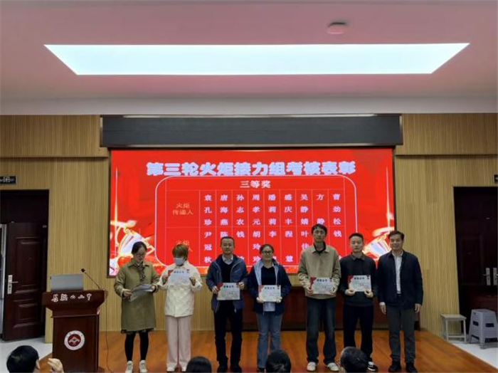 教科處副主任楊威再宣讀第三輪火炬接力組考核表(biǎo)彰(zhāng)通報(bào),校領導(dǎo)隨(suí)後分組為獲獎團隊頒發證書:副校長羅殿玉、教導處副主任喻(yù)全貴為19組三等獎獲得團隊頒獎,工會主席畢小紅為16組二等獎獲得團隊(duì)頒獎,黨委書記書記王東山、校長王玉平為13組一等獎獲得團隊(duì)頒獎,現場氛圍莊重熱烈(liè),彰顯對師徒協作成果(guǒ)的(de)肯定。