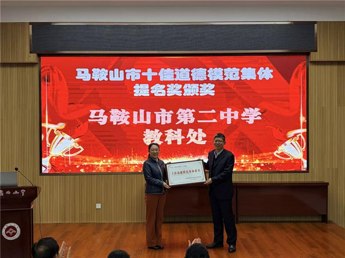 此外,副校長孫濱還宣讀“馬鞍山(shān)市十佳道(dào)德模範集體提(tí)名獎”獲獎通報,書記王東山為(wéi)學校教科處副主任楊威頒發該榮譽證書,表彰教科處在師德建設、教育服務中的突出貢獻。