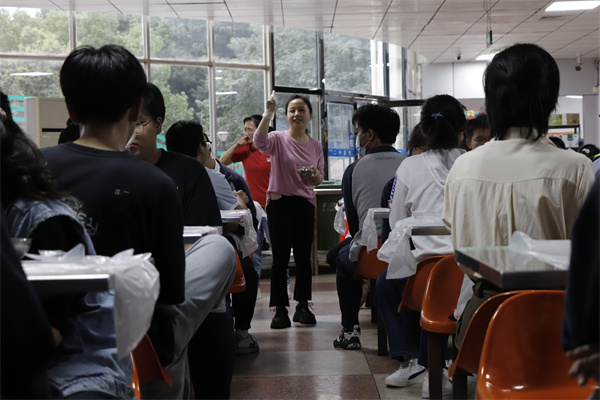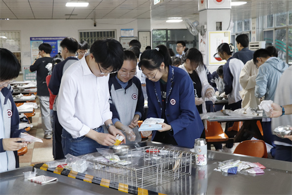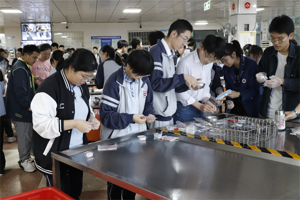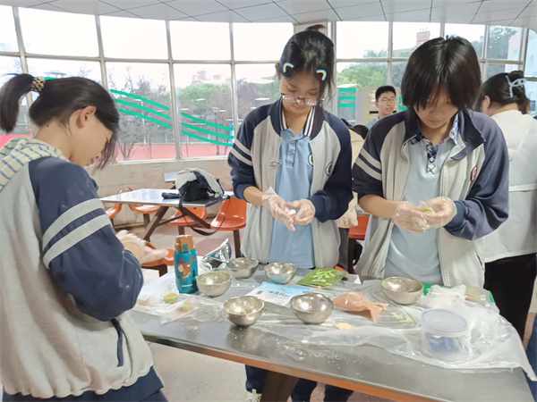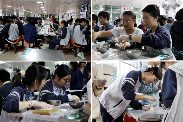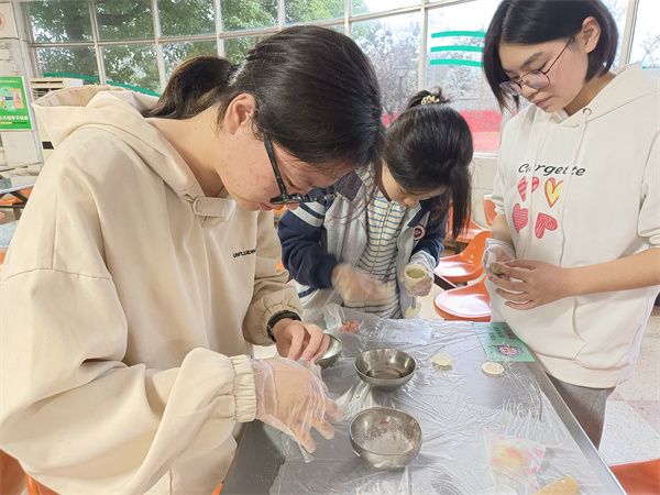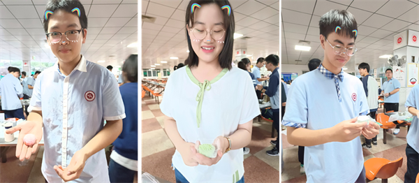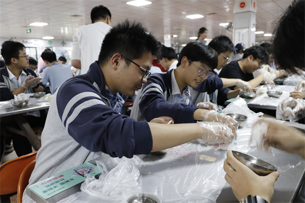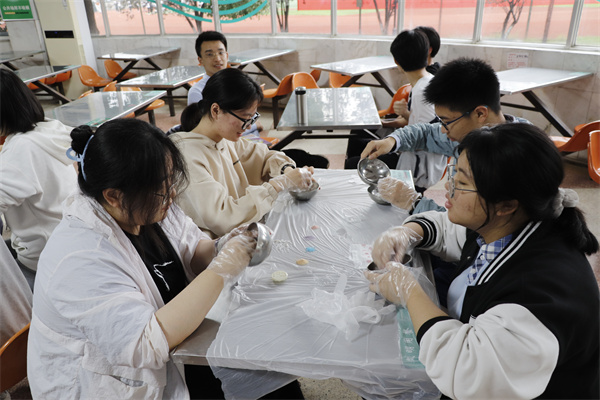 “煮(zhǔ)糯作乳脂為酥,小苑方寸製方圓。”冰皮月餅是一種傳統的中秋節食品(pǐn),用糯(nuò)米粉、澱粉等製作外皮,中間填(tián)充各種口味的餡料(liào),小巧精致,晶瑩剔透。同學們先將適量的糯米粉與澱粉(fěn)倒入碗中,加入清水,用手和製,擀皮,接著根據喜好包上不同口味、顏色的餡料,最(zuì)後用模具壓製成各種形狀。不多時,一隻隻大大小小、形態各異的月餅出現在眾人眼前,食堂內(nèi)處處洋溢著同學們的歡聲笑語。