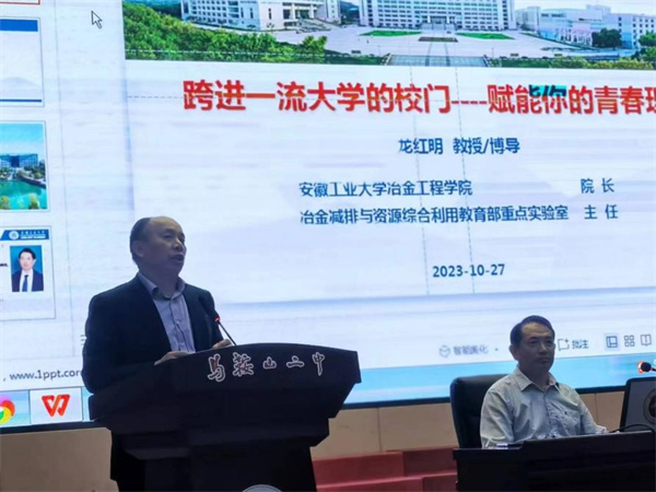 2023年10月27日下午,安徽工業大學冶金工程學院院長、冶金減排與資源綜合利用教育(yù)部重點實驗室主任龍紅明教授(shòu)應邀來我校(xiào)麵向高二年級學生(shēng)開展講座。講座由高二年級部(bù)儲(chǔ)成俊主任主持。