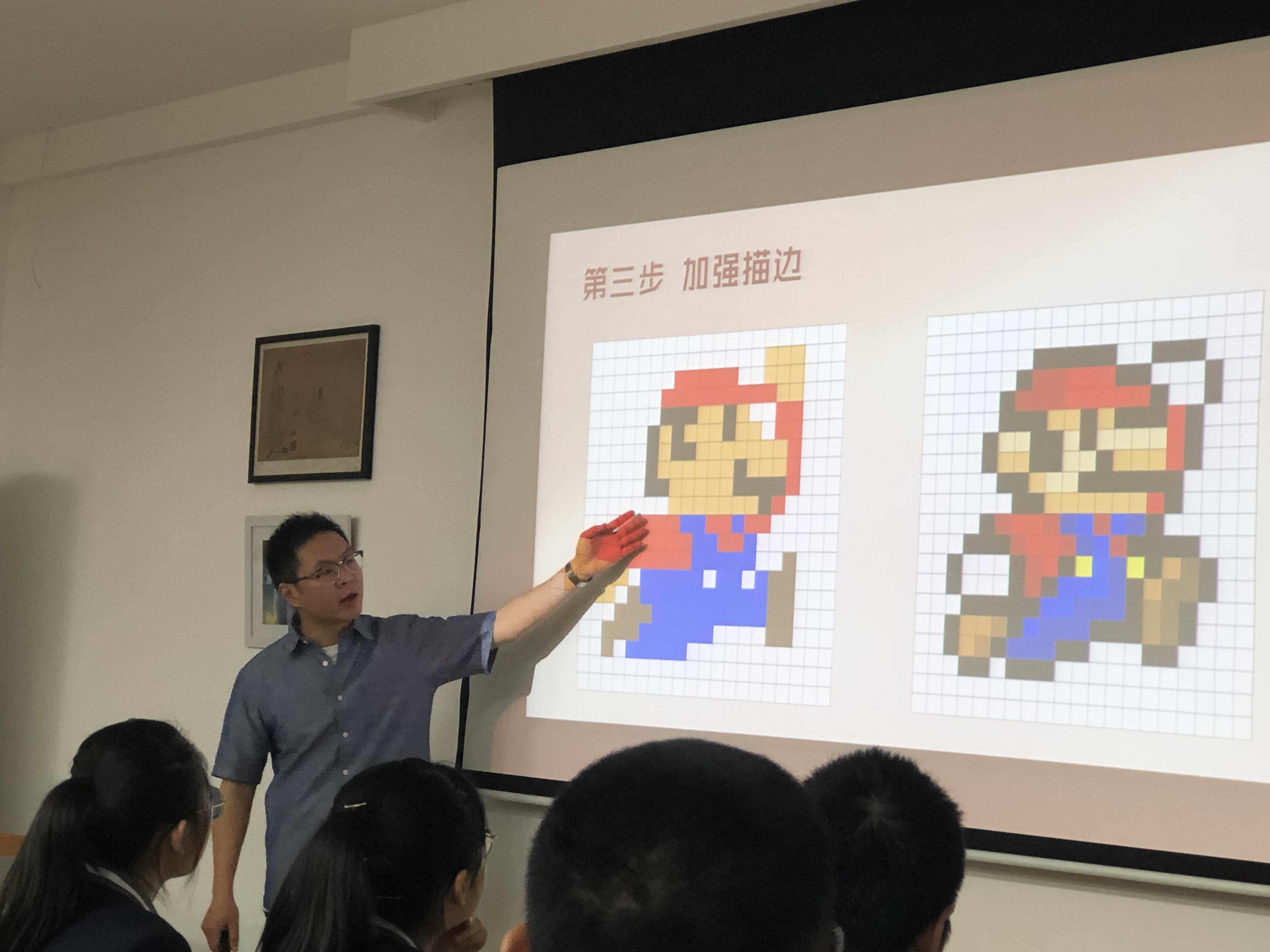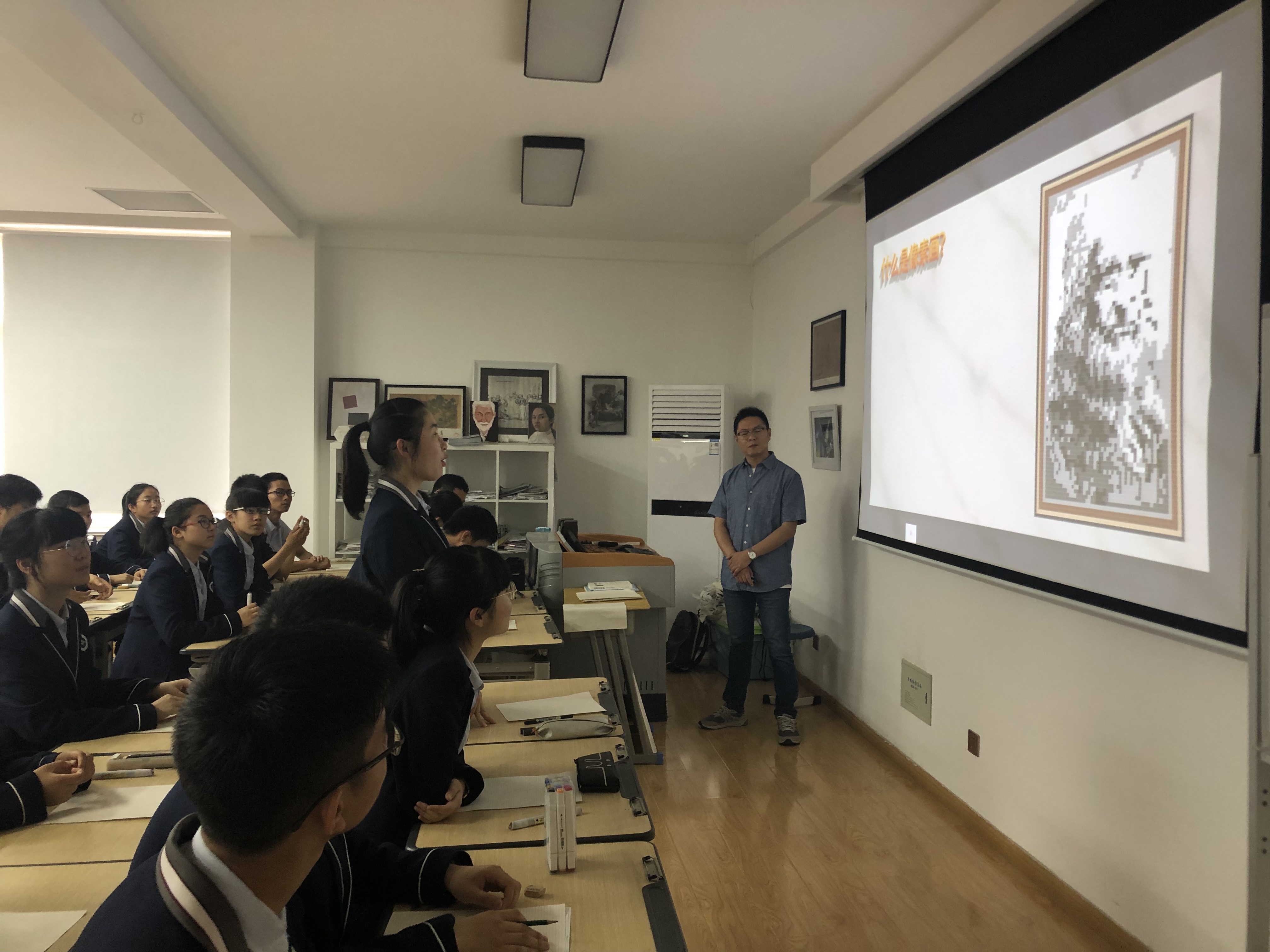 二(èr)中鄭蒲港分校優秀的美術教師周小舟老師帶來的匯報課的課題(tí)是《創意無限——像素畫》。周老師的這節課以美術(shù)核(hé)心(xīn)素養為指導,在設計創新上,為學生們設計了(le)像素繪(huì)畫的表現形式的學習。課堂上周老師以流行(háng)的像素視覺(jiào)作品為導入,分析像素畫的定義特征(zhēng)及創作手(shǒu)法,現場用P S技術向學生示範了如何進行像素化設計(jì),特別是調動學生思考像素塊的構成與繪畫之間的巧妙聯係。多種示範(fàn)畫的前後對比效果,讓學生形象(xiàng)的理解像素畫的創作手法,充分調(diào)動起學生的積極性(xìng)。